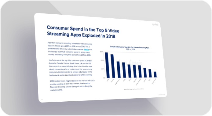Consumer Spend in the Top 5 Video Streaming Apps Exploded in 2018 App store consumer spending in the top 5 video streaming Growth in Consumer Spend in Top 5 Video Streaming Apps apps worldwide grew 285% in 2018 versus 2016. This is 2016 vs. 2018 predominantly driven by subscription revenue. Netflix was 600% the top app by annual consumer spend in nearly every country and nearly every time period from 2016 to 2018. 400% YouTube was in the top 5 for consumer spend in 2018 in Australia, Canada, France, South Korea, UK and the US. Users spend an especially long time in the Youtube app, 200% clearly consuming a lot of content, and this is convincing many to subscribe in order to remove ads, to play in the background and to download videos for offline viewing. 0% 2018 marked heavy fragmentation in the market, with each India Japan China Brazil France Canada Germany provider wanting to own their content. The launch of South Korea United States United Kingdom Disney’s streaming service Disney+ is set to disrupt the market in 2019. Note: iOS and Google Play Stores; China is iOS only 44 COPYRIGHT 2019