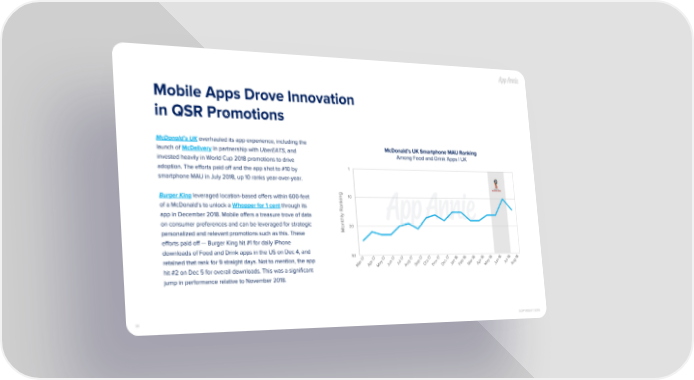 Mobile Apps Drove Innovation in QSR Promotions McDonald’s UK overhauled its app experience, including the McDonald’s UK Smartphone MAU Ranking launch of McDelivery in partnership with UberEATS, and Among Food and Drink Apps | UK invested heavily in World Cup 2018 promotions to drive 1 adoption. The efforts paid off and the app shot to #10 by smartphone MAU in July 2018, up 10 ranks year-over-year. 10 Burger King leveraged location-based offers within 600-feet of a McDonald’s to unlock a Whopper for 1 cent through its app in December 2018. Mobile offers a treasure trove of data on consumer preferences and can be leveraged for strategic 20 Monthly Ranking personalized and relevant promotions such as this. These efforts paid off — Burger King hit #1 for daily iPhone downloads of Food and Drink apps in the US on Dec 4, and 30 retained that rank for 9 straight days. Not to mention, the app Jul-17 Jul-18 Apr-17 Jun-17 Oct-17 Jan-18 Apr-18 Jun-18 Mar-17 Sep-17 Dec-17 Feb-18 Mar-18 Aug-17 Nov-17 May-17 Aug-18 May-18 hit #2 on Dec 5 for overall downloads. This was a significant jump in performance relative to November 2018. 35 COPYRIGHT 2019