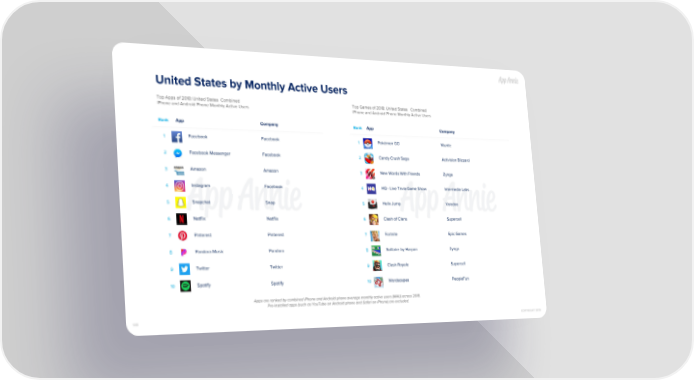 United States by Monthly Active Users Top Apps of 2018: United States Combined Top Games of 2018: United States Combined iPhone and Android Phone Monthly Active Users iPhone and Android Phone Monthly Active Users Rank App Company Rank App Company Facebook Facebook Pokémon GO Niantic 1 1 Facebook Messenger Facebook Candy Crush Saga Activision Blizzard 2 2 Amazon Amazon New Words With Friends Zynga 3 3 Instagram Facebook HQ - Live Trivia Game Show Intermedia Labs 4 4 Snapchat Snap Helix Jump Voodoo 5 5 Netflix Netflix Clash of Clans Supercell 6 6 Pinterest Pinterest Fortnite Epic Games 7 7 Pandora Music Pandora Solitaire by Harpan Zynga 8 8 Twitter Twitter Clash Royale Supercell 9 9 Spotify Spotify Wordscapes PeopleFun 10 10 Apps are ranked by combined iPhone and Android phone average monthly active users (MAU) across 2018. Pre-installed apps (such as YouTube on Android phone and Safari on iPhone) are excluded. 149 COPYRIGHT 2019