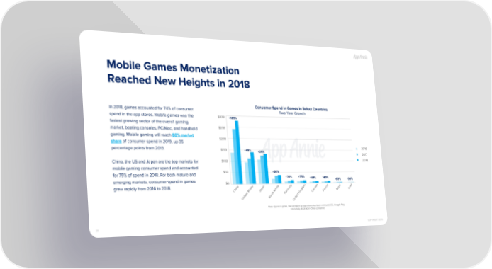 Mobile Games Monetization Reached New Heights in 2018 Consumer Spend in Games in Select Countries In 2018, games accounted for 74% of consumer Two Year Growth spend in the app stores. Mobile games was the $30B +105% fastest growing sector of the overall gaming $25B market, beating consoles, PC/Mac, and handheld gaming. Mobile gaming will reach 60% market $20B share of consumer spend in 2019, up 35 2016 percentage points from 2013. $15B +45% +25% 2017 2018 $10B China, the US and Japan are the top markets for mobile gaming consumer spend and accounted $5B +80% for 75% of spend in 2018. For both mature and +70% +35% +45% +60% +60% +90% emerging markets, consumer spend in games $0 grew rapidly from 2016 to 2018. India China Brazil Japan France Canada Germany South Korea United States United Kingdom Note: Spend is gross, the cut taken by app stores has been removed; iOS, Google Play, Third-Party Android in China combined 20 COPYRIGHT 2019