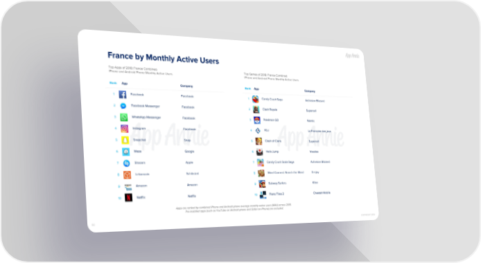 France by Monthly Active Users Top Apps of 2018: France Combined Top Games of 2018: France Combined iPhone and Android Phone Monthly Active Users iPhone and Android Phone Monthly Active Users Rank App Company Rank App Company Facebook Facebook Candy Crush Saga Activision Blizzard 1 1 Facebook Messenger Facebook Clash Royale Supercell 2 2 WhatsApp Messenger Facebook Pokémon GO Niantic 3 3 Instagram Facebook FDJ La Francaise des jeux 4 4 Snapchat Snap Clash of Clans Supercell 5 5 Waze Google Helix Jump Voodoo 6 6 Shazam Apple Candy Crush Soda Saga Activision Blizzard 7 7 Leboncoin Schibsted Word Connect: Search the Word Zenjoy 8 8 Amazon Amazon Subway Surfers Kiloo 9 9 Netflix Netflix Piano Tiles 2 Cheetah Mobile 10 10 Apps are ranked by combined iPhone and Android phone average monthly active users (MAU) across 2018. Pre-installed apps (such as YouTube on Android phone and Safari on iPhone) are excluded. 92 COPYRIGHT 2019