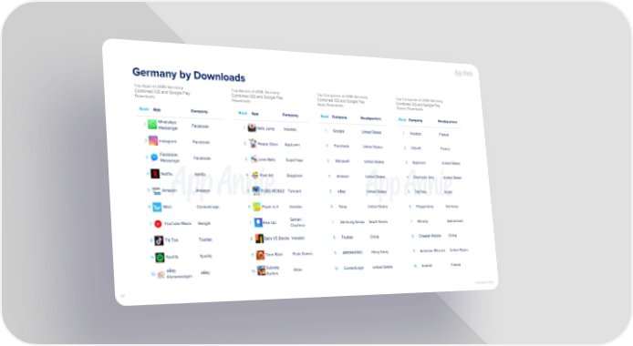 Germany by Downloads Top Apps of 2018: Germany Top Games of 2018: Germany Top Companies of 2018: Germany Top Companies of 2018: Germany Combined iOS and Google Play Combined iOS and Google Play Combined iOS and Google Play Combined iOS and Google Play Downloads Downloads Apps Downloads Games Downloads Rank App Company Rank App Company Rank Company Headquarters Rank Company Headquarters WhatsApp 1 Facebook 1 Helix Jump Voodoo 1 Google United States 1 Voodoo France Messenger 2 Instagram Facebook 2 Happy Glass AppLovin 2 Facebook United States 2 Ubisoft France Facebook 3 Facebook 3 Love Balls SuperTapx 3 Microsoft United States 3 AppLovin United States Messenger 4 Netflix Netflix 4 Pixel Art Easybrain 4 Amazon United States 4 Electronic Arts United States 5 Amazon Amazon 5 PUBG MOBILE Tencent 5 eBay United States 5 TabTale Israel 6 Wish ContextLogic 6 Paper.io 2 Voodoo 6 Snap United States 6 Playgendary Germany Serkan 7 YouTube Music Google 7 Rise Up 7 Samsung Group South Korea 7 Miniclip Switzerland Ozyilmaz 8 Tik Tok Toutiao 8 Balls VS Blocks Voodoo 8 Toutiao China 8 Cheetah Mobile China 9 Spotify Spotify 9 Toon Blast Peak Games 9 ABISHKKING Hong Kong 9 Activision Blizzard United States eBay Subway 10 eBay 10 Kiloo 10 ContextLogic United States 10 Vivendi France Kleinanzeigen Surfers 96 COPYRIGHT 2019