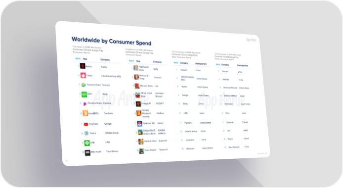 Worldwide by Consumer Spend Top Apps of 2018: Worldwide Top Games of 2018: Worldwide Top Companies of 2018: Worldwide Top Companies of 2018: Worldwide Combined iOS and Google Play Combined iOS and Google Play Combined iOS and Google Play Combined iOS and Google Play Consumer Spend Consumer Spend Apps Consumer Spend Games Consumer Spend Rank App Company Rank App Company Rank Company Headquarters Rank Company Headquarters Fate/Grand 1 Netflix Netflix 1 Sony 1 Tencent China 1 Tencent China Order Honour of InterActiveCorp 2 Tinder InterActiveCorp (IAC) 2 Tencent 2 United States 2 NetEase China Kings (IAC) 3 Tencent Video Tencent 3 Monster Strike mixi 3 Netflix United States 3 Activision Blizzard United States Candy Crush Activision 4 iQIYI Baidu 4 4 Google United States 4 BANDAI NAMCO Japan Saga Blizzard 5 Pandora Music Pandora 5 Lineage M NCSOFT 5 Baidu China 5 Netmarble South Korea Fantasy 6 Kwai(快手) OneSmile 6 Westward NetEase 6 LINE Japan 6 Sony Japan Journey 7 YouTube Google 7 Pokémon GO Niantic 7 Pandora United States 7 Supercell Finland Dragon Ball Z BANDAI 8 Youku Alibaba Group 8 8 Alibaba Group China 8 mixi Japan Dokkan Battle NAMCO 9 LINE LINE 9 Clash of Clans Supercell 9 OneSmile China 9 Playrix Ireland 10 HBO NOW Time Warner 10 Clash Royale Supercell 10 Microsoft United States 10 Giant Network China 70 COPYRIGHT 2019