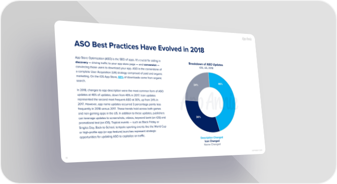 ASO Best Practices Have Evolved in 2018 App Store Optimization (ASO) is the SEO of apps. It’s crucial for aiding in Breakdown of ASO Updates discovery — driving traffic to your app store page — and conversion — iOS, US, 2018 convincing those users to download your app. ASO is the cornerstone of a complete User Acquisition (UA) strategy comprised of paid and organic marketing. On the iOS App Store, 65% of downloads come from organic search. 46% 24% In 2018, changes to app description were the most common form of ASO updates at 46% of updates, down from 49% in 2017. Icon updates represented the second most frequent ASO at 30%, up from 24% in 2017. However, app name updates occurred 3 percentage points less frequently in 2018 versus 2017. These trends hold across both games and non-gaming apps in the US. In addition to these updates, publishers 30% can leverage updates to screenshots, videos, keyword bank (on iOS) and promotional text (on iOS). Topical events — such as Black Friday or Singles Day, Back-to-School, tentpole sporting events like the World Cup or high-profile app (or app feature) launches represent strategic opportunities for updating ASO to capitalize on traffic. Description Changed Icon Changed Name Changed 58 COPYRIGHT 2019