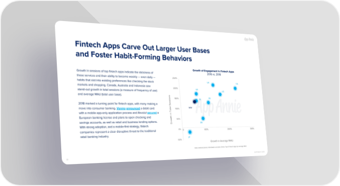 Fintech Apps Carve Out Larger User Bases and Foster Habit-Forming Behaviors Growth of Engagement in Fintech Apps 2016 vs. 2018 Growth in sessions of top fintech apps indicate the stickiness of these services and their ability to become weekly — even daily — 250% UK habits that slot into existing preferences like checking the stock CA markets and shopping. Canada, Australia and Indonesia saw 200% KR US stand-out growth in total sessions (a measure of frequency of use) and average MAU (total user base). FR 150% IN 2018 marked a turning point for fintech apps, with many making a WW move into consumer banking. Venmo announced a debit card 100% with a mobile app-only application process and Revolut secured a European banking license and plans to open checking and 50% savings accounts, as well as retail and business lending options. DE Growth in Total Sessions With strong adoption, and a mobile-first strategy, fintech 0% 0 100% 200% 300% companies represent a clear disruptive threat to the traditional retail banking industry. JP -50% Growth in Average MAU Note: Android phone; Worldwide excludes China; Top 5 Fintech Apps by average MAU 39 COPYRIGHT 2019