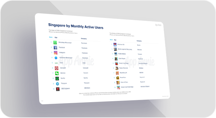 Singapore by Monthly Active Users Top Apps of 2018: Singapore Combined Top Games of 2018: Singapore Combined iPhone and Android Phone Monthly Active Users iPhone and Android Phone Monthly Active Users Rank App Company Rank App Company WhatsApp Messenger Facebook Pokémon GO Niantic 1 1 Facebook Facebook Mobile Legends: Bang bang Moonton 2 2 Instagram Facebook PUBG MOBILE Tencent 3 3 Facebook Messenger Facebook Clash Royale Supercell 4 4 Grab Grab Candy Crush Saga Activision Blizzard 5 5 Carousell Carousell Rules of Survival NetEase 6 6 WeChat Tencent MapleStory M NEXON 7 7 Spotify Spotify Brawl Stars Supercell 8 8 Telegram Telegram Clash of Clans Supercell 9 9 DBS Digibank DBS Bank Candy Crush Soda Saga Activision Blizzard 10 10 Apps are ranked by combined iPhone and Android phone average monthly active users (MAU) across 2018. Pre-installed apps (such as YouTube on Android phone and Safari on iPhone) are excluded. 122 COPYRIGHT 2019