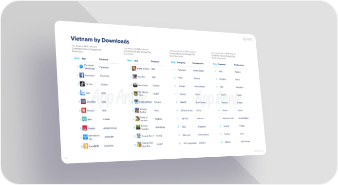 Vietnam by Downloads Top Apps of 2018: Vietnam Top Games of 2018: Vietnam Top Companies of 2018: Vietnam Top Companies of 2018: Vietnam Combined iOS and Google Play Combined iOS and Google Play Combined iOS and Google Play Combined iOS and Google Play Downloads Downloads Apps Downloads Games Downloads Rank App Company Rank App Company Rank Company Headquarters Rank Company Headquarters Facebook 1 Facebook 1 Arena of Valor SEA 1 Facebook United States 1 VNG Vietnam Messenger 2 Facebook Facebook 2 Free Fire SEA 2 VNG Vietnam 2 BabyBus China 3 Tik Tok Toutiao 3 Helix Jump Voodoo 3 Google United States 3 SEA Singapore My Talking 4 Zalo VNG 4 Outfit7 4 Toutiao China 4 Outfit7 Cyprus Tom 5 Zing Mp3 VNG 5 PUBG MOBILE Tencent 5 NAVER South Korea 5 Voodoo France Subway 6 Shopee SEA 6 Kiloo 6 Alibaba Group China 6 Ubisoft France Surfers Rules of 7 B612 NAVER 7 NetEase 7 VIETTEL Vietnam 7 Electronic Arts United States Survival Zombie 8 Lazada Alibaba Group 8 MobiGame 8 SEA Singapore 8 Vivendi France Tsunami WiFi Master 9 LINKSURE 9 Temple Run 2 Imangi 9 Microsoft United States 9 TabTale Israel Key Talking Tom 10 Kwai(快手) OneSmile 10 Outfit7 10 FPT Corporation Vietnam 10 Mobirix South Korea Gold Run 153 COPYRIGHT 2019