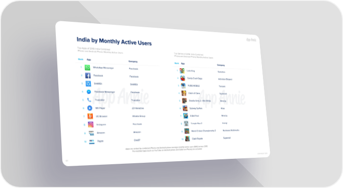 India by Monthly Active Users Top Apps of 2018: India Combined Top Games of 2018: India Combined iPhone and Android Phone Monthly Active Users iPhone and Android Phone Monthly Active Users Rank App Company Rank App Company WhatsApp Messenger Facebook Ludo King Gametion 1 1 Facebook Facebook Candy Crush Saga Activision Blizzard 2 2 SHAREit SHAREit PUBG MOBILE Tencent 3 3 Facebook Messenger Facebook Clash of Clans Supercell 4 4 Truecaller Truecaller Doodle Army 2 : Mini Militia Miniclip 5 5 MX Player J2 Interactive Subway Surfers Kiloo 6 6 UC Browser Alibaba Group 8 Ball Pool Miniclip 7 7 Instagram Facebook Temple Run 2 Imangi 8 8 Amazon Amazon World Cricket Championship 2 Nextwave Multimedia 9 9 Paytm One97 Clash Royale Supercell 10 10 Apps are ranked by combined iPhone and Android phone average monthly active users (MAU) across 2018. Pre-installed apps (such as YouTube on Android phone and Safari on iPhone) are excluded. 101 COPYRIGHT 2019