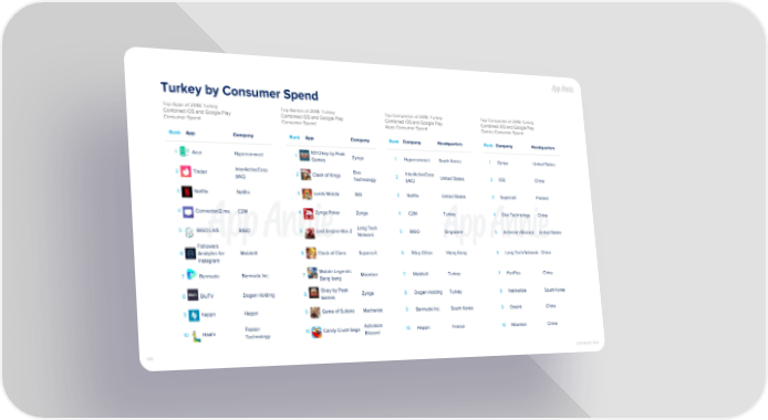 Turkey by Consumer Spend Top Apps of 2018: Turkey Top Games of 2018: Turkey Top Companies of 2018: Turkey Top Companies of 2018: Turkey Combined iOS and Google Play Combined iOS and Google Play Combined iOS and Google Play Combined iOS and Google Play Consumer Spend Consumer Spend Apps Consumer Spend Games Consumer Spend Rank App Company Rank App Company Rank Company Headquarters Rank Company Headquarters 101 Okey by Peak 1 Azar Hyperconnect 1 Zynga 1 Hyperconnect South Korea 1 Zynga United States Games InterActiveCorp Elex InterActiveCorp 2 Tinder 2 Clash of Kings 2 United States 2 IGG China (IAC) Technology (IAC) 3 Netflix Netflix 3 Lords Mobile IGG 3 Netflix United States 3 Supercell Finland 4 Connected2.me C2M 4 Zynga Poker Zynga 4 C2M Turkey 4 Elex Technology China Long Tech 5 BIGO LIVE BIGO 5 Last Empire-War Z 5 BIGO Singapore 5 Activision Blizzard United States Network Followers 6 Analytics for MobileX 6 Clash of Clans Supercell 6 Riley Cillian Hong Kong 6 Long Tech Network China Instagram Mobile Legends: 7 Bermuda Bermuda Inc. 7 Moonton 7 MobileX Turkey 7 FunPlus China Bang bang Okey by Peak 8 BluTV Dogan Holding 8 Zynga 8 Dogan Holding Turkey 8 Netmarble South Korea Games 9 happn Happn 9 Game of Sultans Mechanist 9 Bermuda Inc. South Korea 9 Onemt China Fission Activision 10 Haahi 10 Candy Crush Saga 10 Happn France 10 Moonton China Technology Blizzard 145 COPYRIGHT 2019
