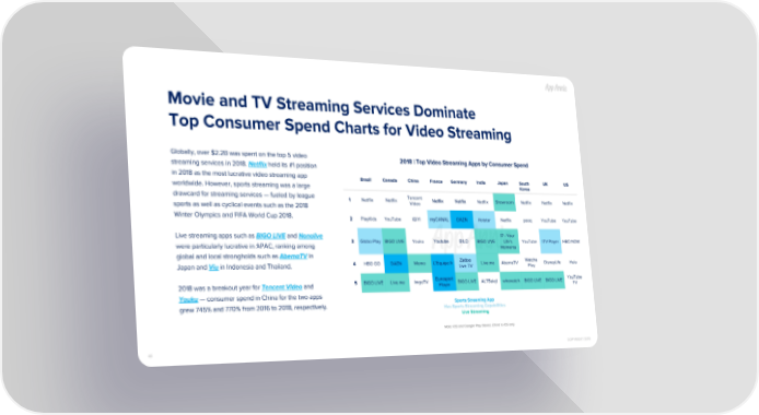 Movie and TV Streaming Services Dominate Top Consumer Spend Charts for Video Streaming Globally, over $2.2B was spent on the top 5 video 2018 | Top Video Streaming Apps by Consumer Spend streaming services in 2018. Netflix held its #1 position in 2018 as the most lucrative video streaming app Brazil Canada China France Germany India Japan South UK US Korea worldwide. However, sports streaming was a large drawcard for streaming services — fueled by league Tencent 1 Netflix Netflix Netflix Netflix Netflix Showroom Netflix Netflix Netflix Video sports as well as cyclical events such as the 2018 Winter Olympics and FIFA World Cup 2018. 2 PlayKids YouTube iQIYI myCANAL DAZN Hotstar Netflix pooq YouTube YouTube 17 - Your Live streaming apps such as BIGO LIVE and Nonolive 3 Globo Play BIGO LIVE Youku Youtube BILD BIGO LIVE Life's YouTube ITV Player HBO NOW were particularly lucrative in APAC, ranking among Moments global and local strongholds such as AbemaTV in Zattoo Watcha 4 HBO GO DAZN Momo L'Equipe.fr Live.me AbemaTV DisneyLife Hulu Japan and Viu in Indonesia and Thailand. Live TV Play Eurosport YouTube 5 BIGO LIVE Live.me ImgoTV BIGO LIVE ALTBalaji whowatch BIGO LIVE BIGO LIVE Player TV 2018 was a breakout year for Tencent Video and Youku — consumer spend in China for the two apps Sports Streaming App grew 745% and 770% from 2016 to 2018, respectively. Has Sports Streaming Capabilities Live Streaming Note: iOS and Google Play Stores; China is iOS only 45 COPYRIGHT 2019