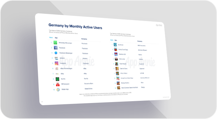 Germany by Monthly Active Users Top Apps of 2018: Germany Combined Top Games of 2018: Germany Combined iPhone and Android Phone Monthly Active Users iPhone and Android Phone Monthly Active Users Rank App Company Rank App Company WhatsApp Messenger Facebook QuizClash MAG Interactive 1 1 Facebook Facebook Candy Crush Saga Activision Blizzard 2 2 Facebook Messenger Facebook Pokémon GO Niantic 3 3 Amazon Amazon Helix Jump Voodoo 4 4 Instagram Facebook Clash Royale Supercell 5 5 eBay Kleinanzeigen eBay Clash of Clans Supercell 6 6 eBay eBay 4 Pics 1 Word LOTUM 7 7 Spotify Spotify Candy Crush Soda Saga Activision Blizzard 8 8 DB Navigator Deutsche Bahn Subway Surfers Kiloo 9 9 Wetter App WetterOnline Word Connect: Search the Word Zenjoy 10 10 Apps are ranked by combined iPhone and Android phone average monthly active users (MAU) across 2018. Pre-installed apps (such as YouTube on Android phone and Safari on iPhone) are excluded. 95 COPYRIGHT 2019