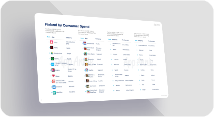 Finland by Consumer Spend Top Apps of 2018: Finland Top Games of 2018: Finland Top Companies of 2018: Finland Top Companies of 2018: Finland Combined iOS and Google Play Combined iOS and Google Play Combined iOS and Google Play Combined iOS and Google Play Consumer Spend Consumer Spend Apps Consumer Spend Games Consumer Spend Rank App Company Rank App Company Rank Company Headquarters Rank Company Headquarters InterActiveCorp InterActiveCorp 1 Tinder 1 Pokémon GO Niantic 1 United States 1 Activision Blizzard United States (IAC) (IAC) Candy Crush Activision 2 Netflix Netflix 2 2 Netflix United States 2 Supercell Finland Saga Blizzard 3 Google Drive Google 3 Clash Royale Supercell 3 Google United States 3 Niantic United States 4 Spotify Spotify 4 Growtopia Ubisoft 4 F-Secure Finland 4 Ubisoft France F-Secure Freedome 5 F-Secure 5 Clash of Clans Supercell 5 Microsoft United States 5 Electronic Arts United States VPN Modern Times 6 Viaplay 6 Hay Day Supercell 6 Spotify Sweden 6 FunPlus China Group Empires & Small Giant Modern Times 7 iDates Boranu 7 7 Sweden 7 Playrix Ireland Puzzles Games Group 020202 Caller - 8 Fonecta 8 Guns of Glory FunPlus 8 MagazineCloner United Kingdom 8 Rovio Finland See who's calling 9 OneDrive Microsoft 9 Idle Heroes DH Games 9 Boranu Netherlands 9 IGG China Candy Crush Activision 10 WordDive WordDive 10 10 Badoo United Kingdom 10 Zynga United States Soda Saga Blizzard 91 COPYRIGHT 2019