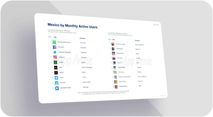 Mexico by Monthly Active Users Top Apps of 2018: Mexico Combined Top Games of 2018: Mexico Combined iPhone and Android Phone Monthly Active Users iPhone and Android Phone Monthly Active Users Rank App Company Rank App Company WhatsApp Messenger Facebook Candy Crush Saga Activision Blizzard 1 1 Facebook Facebook Clash Royale Supercell 2 2 Facebook Messenger Facebook Pokémon GO Niantic 3 3 Instagram Facebook Helix Jump Voodoo 4 4 Spotify Spotify Free Fire SEA 5 5 Uber Uber Technologies PUBG MOBILE Tencent 6 6 Netflix Netflix Trivia Crack Etermax 7 7 Twitter Twitter Candy Crush Soda Saga Activision Blizzard 8 8 Mi Telcel America Movil Clash of Clans Supercell 9 9 Microsoft Outlook Microsoft Subway Surfers Kiloo 10 10 Apps are ranked by combined iPhone and Android phone average monthly active users (MAU) across 2018. Pre-installed apps (such as YouTube on Android phone and Safari on iPhone) are excluded. 113 COPYRIGHT 2019
