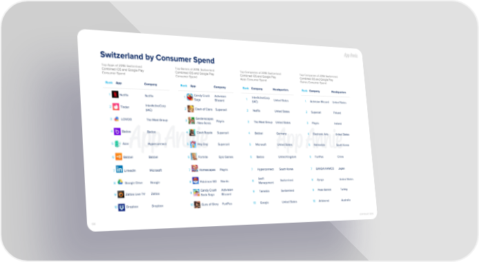 Switzerland by Consumer Spend Top Apps of 2018: Switzerland Top Games of 2018: Switzerland Top Companies of 2018: Switzerland Top Companies of 2018: Switzerland Combined iOS and Google Play Combined iOS and Google Play Combined iOS and Google Play Combined iOS and Google Play Consumer Spend Consumer Spend Apps Consumer Spend Games Consumer Spend Rank App Company Rank App Company Rank Company Headquarters Rank Company Headquarters Candy Crush Activision InterActiveCorp 1 Netflix Netflix 1 1 United States 1 Activision Blizzard United States Saga Blizzard (IAC) InterActiveCorp 2 Tinder 2 Clash of Clans Supercell 2 Netflix United States 2 Supercell Finland (IAC) Gardenscapes 3 LOVOO The Meet Group 3 Playrix 3 The Meet Group United States 3 Playrix Ireland - New Acres 4 Badoo Badoo 4 Clash Royale Supercell 4 Babbel Germany 4 Electronic Arts United States 5 Azar Hyperconnect 5 Hay Day Supercell 5 Microsoft United States 5 Netmarble South Korea 6 Babbel Babbel 6 Fortnite Epic Games 6 Badoo United Kingdom 6 FunPlus China 7 LinkedIn Microsoft 7 Homescapes Playrix 7 Hyperconnect South Korea 7 BANDAI NAMCO Japan Swift 8 Google Drive Google 8 Pokémon GO Niantic 8 Switzerland 8 Zynga United States Management Candy Crush Activision 9 Zattoo Live TV Zattoo 9 9 Tamedia Switzerland 9 Peak Games Turkey Soda Saga Blizzard 10 Dropbox Dropbox 10 Guns of Glory FunPlus 10 Google United States 10 Aristocrat Australia 136 COPYRIGHT 2019