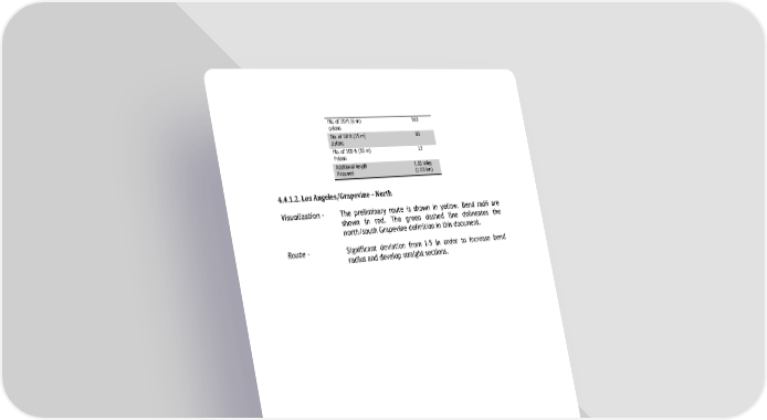 No. of 20 ft (6 m) 563 pylons No. of 50 ft (15 m) 80 pylons No. of 100 ft (30 m) 12 Pylons Additional length 1.20 miles Required (1.93 km) 4.4.1.2. Los Angeles/Grapevine – North Visualization - The preliminary route is shown in yellow. Bend radii are shown in red. The green dashed line delineates the north/south Grapevine definition in this document. Route - Significant deviation from I-5 in order to increase bend radius and develop straight sections.