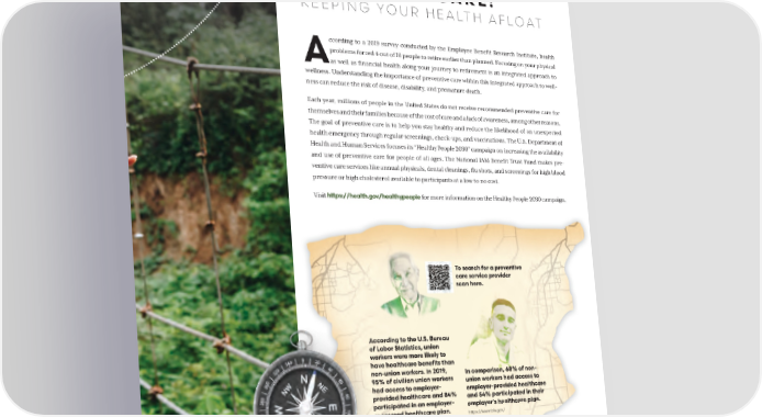 PREVENTIVE CARE: KEEPING YOUR HEALTH AFLOAT ccording to a 2019 survey conducted by the Employee Benefit Research Institute, health problems forced 4 out of 10 people to retire earlier than planned. Focusing on your physical Aas well as financial health along your journey to retirement is an integrated approach to wellness. Understanding the importance of preventive care within this integrated approach to well- the ness can reduce the risk of disease, disability, and premature death. Each year, millions of people in the United States do not receive recommended preventive care for themselves and their families because of the cost of care and a lack of awareness, among other reasons. Way The goal of preventive care is to help you stay healthy and reduce the likelihood of an unexpected health emergency through regular screenings, check-ups, and vaccinations. The U.S. Department of Health and Human Services focuses its “Healthy People 2030” campaign on increasing the availability and use of preventive care for people of all ages. The National IAM Benefit Trust Fund makes pre- ventive care services like annual physicals, dental cleanings, flu shots, and screenings for high blood pressure or high cholesterol available to participants at a low to no cost. Visit https://health.gov/healthypeople for more information on the Healthy People 2030 campaign. To search for a preventive care service provider scan here. According to the U.S. Bureau of Labor Statistics, union workers were more likely to have healthcare benefits than non-union workers. In 2019, In comparison, 68% of non- 95% of civilian union workers union workers had access to had access to employer- employer-provided healthcare provided healthcare and 84% and 54% participated in their participated in an employer- employer’s healthcare plan. sponsored healthcare plan. https://www.bls.gov/ 07