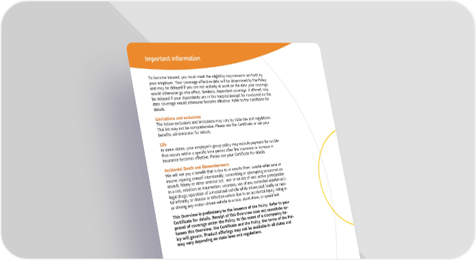 Important information To become insured, you must meet the eligibility requirements set forth by your employer. Your coverage effective date will be determined by the Policy and may be delayed if you are not actively at work on the date your coverage would otherwise go into effect. Similarly, dependent coverage, if offered, may be delayed if your dependents are in the hospital (except for newborns) on the date coverage would otherwise become effective. Refer to the Certificate for details. Limitations and exclusions The below exclusions and limitations may vary by state law and regulations. This list may not be comprehensive. Please see the Certificate or ask your benefits administrator for details. Life In some states, your employer’s group policy may exclude payment for suicide that occurs within a specific time period after the insurance or increase in insurance becomes effective. Please see your Certificate for details. Accidental Death and Dismemberment We will not pay a benefit that is due to or results from: suicide while sane or insane; injuring oneself intentionally; committing or attempting to commit an assault, felony or other criminal act; war or an act of war; active participation in a riot, rebellion or insurrection; voluntary use of any controlled substance/il- legal drugs; operation of a motorized vehicle while intoxicated; bodily or men- tal infirmity or disease or infection unless due to an accidental injury; riding in or driving any motor-driven vehicle in a race, stunt show, or speed test. This Overview is preliminary to the issuance of the Policy. Refer to your Certificate for details. Receipt of this Overview does not constitute ap- proval of coverage under the Policy. In the event of a discrepancy be- tween this Overview, the Certificate and the Policy, the terms of the Pol- icy will govern. Product offerings may not be available in all states and may vary depending on state laws and regulations. Sun Life companies include Sun Life and Health Insurance Company (U.S.) and Sun Life Assurance Company of Canada (collectively, “Sun Life”). Group life insurance policies are underwritten by Sun Life Assurance Company of Canada (Wellesley Hills, MA) in all states, except New York, under Policy Form Series 93P-LH, 98P-ADD, 12-GP-01, 15-LF-01, 12- GPPort-P01, 12-LFPort-C-01, 15-ADD-C-01, 13-ADD-C-01 and 13-ADDPort-C-01. © 2024 Sun Life Assurance Company of Canada, Wellesley Hills, MA 02481. All rights reserved. The Sun Life name and logo are registered trademarks of Sun Life Assurance Company of Canada. Visit us at www.sunlife.com/us. GVBH-EE-8384 SLPC 29579 800-247-6875 • sunlife.com/us/ 800-786-5433 • sunlife.com/us/ Basic Life Insurance