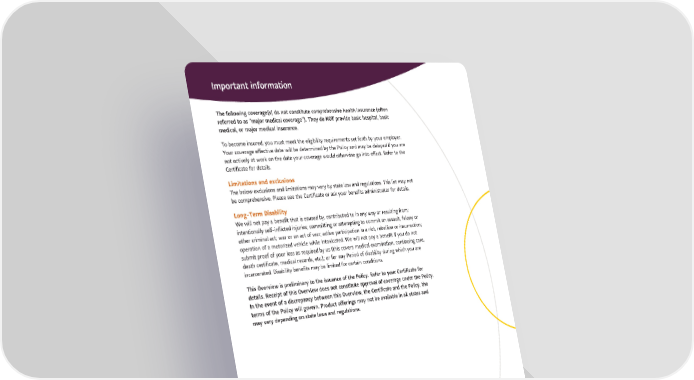 Important information The following coverage(s) do not constitute comprehensive health insurance (often referred to as “major medical coverage”). They do NOT provide basic hospital, basic medical, or major medical insurance. To become insured, you must meet the eligibility requirements set forth by your employer. Your coverage effective date will be determined by the Policy and may be delayed if you are not actively at work on the date your coverage would otherwise go into effect. Refer to the Certificate for details. Limitations and exclusions The below exclusions and limitations may vary by state law and regulations. This list may not be comprehensive. Please see the Certificate or ask your benefits administrator for details. Long-Term Disability We will not pay a benefit that is caused by, contributed to in any way or resulting from: intentionally self-inflicted injuries; committing or attempting to commit an assault, felony or other criminal act; war or an act of war; active participation in a riot, rebellion or insurrection; operation of a motorized vehicle while intoxicated. We will not pay a benefit if you do not submit proof of your loss as required by us (this covers medical examination, continuing care, death certificate, medical records, etc.); or for any Period of disability during which you are incarcerated. Disability benefits may be limited for certain conditions. This Overview is preliminary to the issuance of the Policy. Refer to your Certificate for details. Receipt of this Overview does not constitute approval of coverage under the Policy. In the event of a discrepancy between this Overview, the Certificate and the Policy, the terms of the Policy will govern. Product offerings may not be available in all states and may vary depending on state laws and regulations. Sun Life companies include Sun Life and Health Insurance Company (U.S.) and Sun Life Assurance Company of Canada (collectively, “Sun Life”). Group insurance policies are underwritten by Sun Life Assurance Company of Canada (Wellesley Hills, MA) in all states, except New York, under Policy Form Series 93P-LH, 12-GP-01, 12-DI-C-01, 15-GP-01, 16-DI- C-01, TDBPOLICY-2006 and TDI-POLICY. © 2019 Sun Life Assurance Company of Canada, Wellesley Hills, MA 02481. All rights reserved. Sun Life and the globe symbol are trademarks of Sun Life Assurance Company of Canada. Visit us at www.sunlife.com/ us. GVBH-EE-8384 SLPC 29579 800-247-6875 • sunlife.com/us Long-Term Disability Insurance