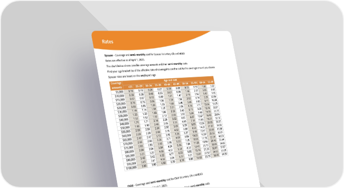 Rates Spouse-Coverageandsemi-monthlycostforSpouseVoluntaryLifeandAD&D. Rates are effective as of April 1, 2025. Thechartbelowshowspossible coverage amountsand their semi-monthlycosts. Find your age bracket (as of the effective date of coverage) to see the cost for the coverage amount you choose. Spouse rates are based on the employee's age. Coverage Age and cost amounts