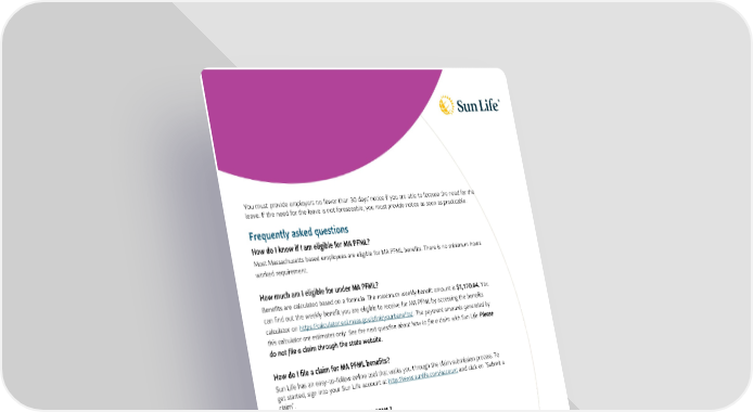 You must provide employers no fewer than 30 days’ notice if you are able to foresee the need for the leave. If the need for the leave is not foreseeable, you must provide notice as soon as practicable. Frequently asked questions How do I know if I am eligible for MA PFML? Most Massachusetts based employees are eligible for MA PFML benefits. There is no minimum hours worked requirement. How much am I eligible for under MA PFML? Benefits are calculated based on a formula. The maximum weekly benefit amount is $1,170.64. You can find out the weekly benefit you are eligible to receive for MA PFML by accessing the benefits calculator on https://calculator.eol.mass.gov/pfml/yourbenefits/. The payment amounts generated by this calculator are estimates only. See the next question about how to file a claim with Sun Life. Please do not file a claim through the state website. How do I file a claim for MA PFML benefits? Sun Life has an easy-to-follow online tool that walks you through the claim submission process. To get started, sign into your Sun Life account at http://www.sunlife.com/account and click on “Submit a claim”. Where can I learn more about MA PFML? Visit www.mass.gov/pfml. Sun Life’s fully insured MA PFML policy is issued by Sun Life Assurance Company of Canada (Wellesley Hills, MA) under Policy Form Series 20-PFML-GP-01-MA. Sun Life’s self-insured or administrative services-only MA PFML service is administrated by Sun Life Assurance Company of Canada (Wellesley Hills, MA). This service is not insurance. © 2024 Sun Life Assurance Company of Canada, Wellesley Hills, MA 02481. All rights reserved. The Sun Life name and logo are registered trademarks of Sun Life Assurance Company of Canada. Visit us at www.sunlife.com/us. GAMSBH-EE-9567-l #1231007123 10/24 (exp. 10/26) 800-247-6875 • sunlife.com/us sunlife.com 800-SUN-LIFE (786-5433)