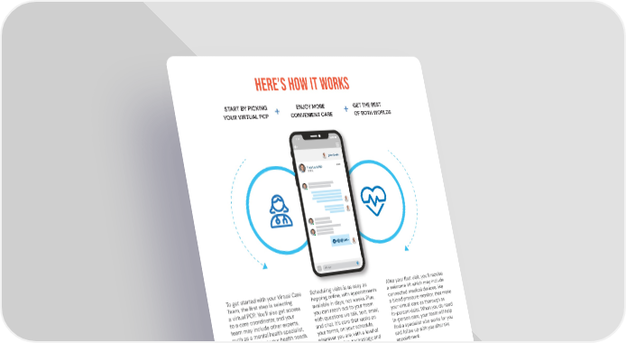 HERE’S HOW IT WORKS START BY PICKING + ENJOY MORE + GET THE BEST YOUR VIRTUAL PCP CONVENIENT CARE OF BOTH WORLDS 8:30 John Smith Tracy Lewis MD Online Mesage To get started with your Virtual Care Scheduling visits is as easy as After your first visit, you’ll receive Team, the first step is selecting hopping online, with appointments a welcome kit which may include a virtual PCP. You’ll also get access available in days, not weeks. Plus, connected medical devices, like to a care coordinator, and your you can reach out to your team a blood pressure monitor, that make team may include other experts, with questions via talk, text, email, your virtual care as thorough as such as a mental health specialist, and chat. It’s care that works on in-person visits. When you do need picked based on your health needs. your terms, on your schedule, in-person care, your team will help It’s the care you need most, in the wherever you are, with a level of find a specialist who works for you most convenient way. communication, technology, and and follow up with you after the access that will surprise you. appointment. Blue Cross Blue Shield of Massachusetts complies with applicable federal civil rights laws and does not discriminate on the basis of race, color, national origin, age, disability, sex, sexual orientation, or gender identity. ATTENTION: If you don’t speak English, language assistance services, free of charge, are available to you. Call Member Service at the number on your ID card (TTY: 711). ATENCIÓN: Si habla español, tiene a su disposición servicios gratuitos de asistencia con el idioma. Llame al número de Servicio al Cliente que figura en su tarjeta de identificación (TTY: 711). ATENÇÃO: Se fala português, são-lhe disponibilizados gratuitamente serviços de assistência de idiomas. Telefone para os Serviços aos Membros, através do número no seu cartão ID (TTY: 711). ® Registered Marks of the Blue Cross and Blue Shield Association. 002026251 32-6765 (8/24) © 2024 Blue Cross and Blue Shield of Massachusetts, Inc., or Blue Cross and Blue Shield of Massachusetts HMO Blue, Inc.