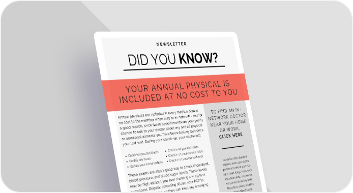 Aside from the standard physical exam your doctor performs to check your vital signs, heart, lungs, head, neck, and abdominals, your doctor may order laboratory tests. These tests could include a complete blood count, chemistry panel, and urinalysis. Men may undergo a testicular exam, and for men over 40 they may receive a prostate exam. Women may get a breast exam. Be sure to tell your doctor about any problem s or symptoms you're experiencing. Check for possible illness Identify any issues Update your immunizations DID YOU KNOW? Annual physicals are included in every medical plan at no cost to the member when they're in-network - and for a good reason, since these appointments are your yearly chance to talk to your doctor about any and all physical or emotional ailments you have been dealing with since your last visit. During your check-up, your doctor will: YOUR ANNUAL PHYSICAL IS INCLUDED AT NO COST TO YOU TO FIND AN IN- NETWORK DOCTOR NEAR YOUR HOME OR WORK, CLICK HERE These exams are also a good way to check cholesterol, blood pressure, and blood sugar levels. These levels may be high without you ever showing any signs or symptoms. Regular screening allows your PCP to establish a baseline, so they can treat any emerging conditions before they become severe. Check in on your diet habits Check in on your exercise habits Check in on your mental health