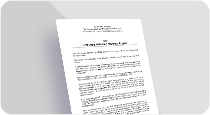 attached to and made part of Blue Cross and Blue Shield of Massachusetts HMO Blue, Inc. Preferred Blue PPO Preferred Provider Plan Subscriber Certificate R13-7040 (2022) to be attached to HMO-PPO Page 1 hppo13-7040 Rider Cost Share Assistance Pharmacy Program This rider modifies the terms of your health plan. Please keep this rider with your Subscriber Certificate for easy reference. The outpatient benefits described in your Subscriber Certificate for covered drugs and supplies have been changed. Your health plan includes a cost share assistance program for certain specialty drugs and/or supplies. Cost share assistance is a process in which the health plan facilitates your enrollment in a program where drug manufacturers provide financial support to members by reducing or removing cost share applied to a drug and/or supply. For covered drugs and supplies that are eligible under this cost share assistance program, the initial cost share amount that is provided will be equal to 30% of the total cost of the drug or supply. When you enroll for cost share assistance with a drug manufacturer for an eligible covered drug or supply, the initial cost share amount will be either reduced or removed. In these cases, cost share assistance is provided by a drug manufacturer on the initial cost share. This means that your final cost share amount will be calculated based off of the initial cost share amount minus the drug manufacturer’s cost share assistance. The final cost share amount that you will pay is described in the cost share assistance drug list. If you choose not to enroll for cost share assistance with a drug manufacturer for an eligible covered drug or supply, the initial cost share amount will not be reduced or removed and your cost share amount will be higher. This means that the final cost share amount that you will pay is equal to 30% of the total cost of the drug or supply. There may be times when you cannot enroll for cost share assistance with a drug manufacturer for a certain covered drug or supply that may otherwise be eligible under this cost share assistance program. Some examples of when this will occur include (but are not limited to): when the drug or supply is not approved by the Food and Drug Administration to treat your condition; or, when the drug or supply has specific age restrictions that you do not meet. In these cases, the provisions of this cost share assistance program will not apply, and you will pay the cost share amount that applies for all other covered drugs and supplies as described in your Schedule of Benefits and/or riders. The cost share amounts that you pay for these drugs and supplies as described above will count toward your out-of-pocket maximum. To obtain the cost share assistance drug list that describes the drugs and/or supplies eligible for cost share assistance and their applicable cost share, you can call the Blue Cross Blue Shield HMO Blue customer service office. The toll-free phone number is shown on your ID card. Or, you may log on to the Blue Cross Blue Shield HMO Blue internet Web site at www.bluecrossma.org. The list of these specialty drugs and supplies may change from time to time. This rider does not change the cost share amount that you will pay for all other covered drugs and supplies. Refer to your Schedule of Benefits and/or riders for your cost share amount for other covered drugs and supplies. All other provisions remain as described in your Subscriber Certificate.