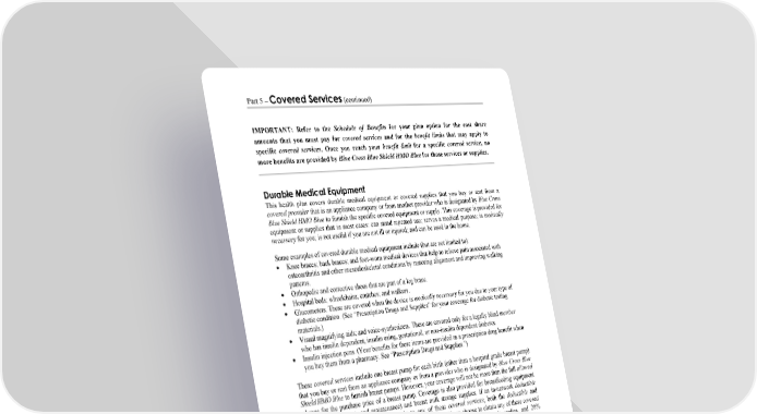Part 5 – Covered Services (continued) IMPORTANT: Refer to the Schedule of Benefits for your plan option for the cost share amounts that you must pay for covered services and for the benefit limits that may apply to specific covered services. Once you reach your benefit limit for a specific covered service, no more benefits are provided by Blue Cross Blue Shield HMO Blue for those services or supplies. WORDS IN ITALICS ARE EXPLAINED IN PART 2. Page 40 Durable Medical Equipment This health plan covers durable medical equipment or covered supplies that you buy or rent from a covered provider that is an appliance company or from another provider who is designated by Blue Cross Blue Shield HMO Blue to furnish the specific covered equipment or supply. This coverage is provided for equipment or supplies that in most cases: can stand repeated use; serves a medical purpose; is medically necessary for you; is not useful if you are not ill or injured; and can be used in the home. Some examples of covered durable medical equipment include (but are not limited to): Knee braces; back braces; and foot-worn medical devices that help to relieve pain associated with osteoarthritis and other musculoskeletal conditions by restoring alignment and improving walking patterns. Orthopedic and corrective shoes that are part of a leg brace. Hospital beds; wheelchairs; crutches; and walkers. Glucometers. These are covered when the device is medically necessary for you due to your type of diabetic condition. (See “Prescription Drugs and Supplies” for your coverage for diabetic testing materials.) Visual magnifying aids; and voice-synthesizers. These are covered only for a legally blind member who has insulin dependent, insulin using, gestational, or non-insulin dependent diabetes. Insulin injection pens. (Your benefits for these items are provided as a prescription drug benefit when you buy them from a pharmacy. See “Prescription Drugs and Supplies.”) These covered services include one breast pump for each birth (other than a hospital grade breast pump) that you buy or rent from an appliance company or from a provider who is designated by Blue Cross Blue Shield HMO Blue to furnish breast pumps. However, your coverage will not be more than the full allowed charge for the purchase price of a breast pump. Coverage is also provided for breastfeeding equipment (including pump parts and maintenance) and breast milk storage supplies. If an in-network deductible and/or coinsurance would normally apply to any of these covered services, both the deductible and coinsurance will be waived for your in-network benefits. Or, if you choose to obtain any of these covered services from a non-preferred provider, you must pay your deductible, when it applies, and 20% coinsurance. (If your health plan is a grandfathered health plan under the Affordable Care Act, a deductible and/or coinsurance that would normally apply to you for durable medical equipment will still apply for a covered breast pump.) No benefits are provided for a hospital grade breast pump. From time to time, the equipment or supplies that are covered by this health plan may change. This change will be based on Blue Cross Blue Shield HMO Blue’s periodic review of its medical policies and medical technology assessment criteria to reflect new applications and technologies. You can call the Blue Cross Blue Shield HMO Blue customer service office for help to find out what is covered. (See Part 1.) Blue Cross Blue Shield HMO Blue will decide whether to rent or buy durable medical equipment. If Blue Cross Blue Shield HMO Blue decides to rent the equipment, your benefits will not be more than the amount that would have been covered if the equipment were bought. This health plan covers the least