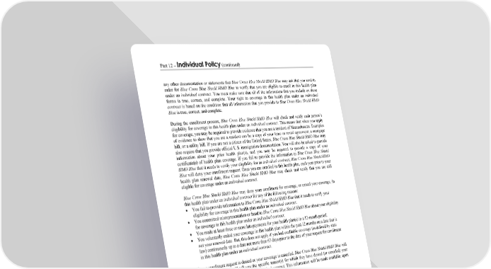 Part 12 – Individual Policy (continued) WORDS IN ITALICS ARE EXPLAINED IN PART 2. Page 107 any other documentation or statements that Blue Cross Blue Shield HMO Blue may ask that you send in order for Blue Cross Blue Shield HMO Blue to verify that you are eligible to enroll in this health plan under an individual contract. You must make sure that all of the information that you include on these forms is true, correct, and complete. Your right to coverage in this health plan under an individual contract is based on the condition that all information that you provide to Blue Cross Blue Shield HMO Blue is true, correct, and complete. During the enrollment process, Blue Cross Blue Shield HMO Blue will check and verify each person’s eligibility for coverage in this health plan under an individual contract. This means that when you apply for coverage, you may be required to provide evidence that you are a resident of Massachusetts. Examples of evidence to show that you are a resident can be a copy of your lease or rental agreement, a mortgage bill, or a utility bill. If you are not a citizen of the United States, Blue Cross Blue Shield HMO Blue may also require that you provide official U.S. immigration documentation. You will also be asked to provide information about your prior health plan(s), and you may be required to provide a copy of your certificate(s) of health plan coverage. If you fail to provide the information to Blue Cross Blue Shield HMO Blue that it needs to verify your eligibility for an individual contract, Blue Cross Blue Shield HMO Blue will deny your enrollment request. Once you are enrolled in this health plan, each year prior to your health plan renewal date, Blue Cross Blue Shield HMO Blue may check and verify that you are still eligible for coverage under an individual contract. Blue Cross Blue Shield HMO Blue may deny your enrollment for coverage, or cancel your coverage, in this health plan under an individual contract for any of the following reasons: You fail to provide information to Blue Cross Blue Shield HMO Blue that it needs to verify your eligibility for coverage in this health plan under an individual contract. You committed misrepresentation or fraud to Blue Cross Blue Shield HMO Blue about your eligibility for coverage in this health plan under an individual contract. You made at least three or more late payments for your health plan(s) in a 12-month period. You voluntarily ended your coverage in this health plan within the past 12 months on a date that is not your renewal date. But, this does not apply if you had creditable coverage (as defined by state law) continuously up to a date not more than 63 days prior to the date of your request for enrollment in this health plan under an individual contract. If your enrollment request is denied or your coverage is canceled, Blue Cross Blue Shield HMO Blue will send you a letter that will tell you the specific reason(s) for which they have denied (or canceled) your coverage in this health plan under an individual contract. This information will be made available, upon request, to the Massachusetts Commissioner of Insurance. Newly enrolled members will not have a waiting period before Blue Cross Blue Shield HMO Blue will provide access to health care services and benefits. Membership Changes Generally, the subscriber may make membership changes (for example, change from a plan that covers only one person to a family plan) only if the subscriber has a change in family status. This includes a change such as: marriage or divorce; birth, adoption or change in custody of a child; death of an enrolled spouse or dependent; or the loss of an enrolled dependent’s eligibility under the subscriber’s individual contract. If you want to ask for a membership change or you need to change your name or mailing address, you should call or write to Blue Cross Blue Shield HMO Blue. Blue Cross Blue Shield HMO Blue will send you any special forms that you may need. You must request a membership change within 30 days of the reason for the change. Or, if the newly eligible person had prior creditable coverage (as defined by state law), the change must be requested within 63 days of the termination date of the prior