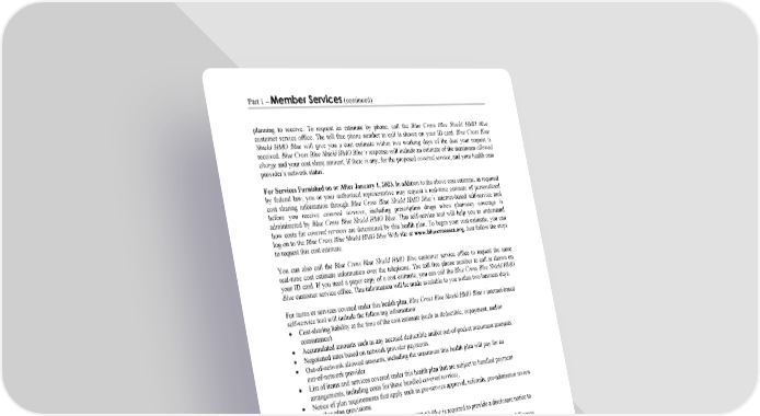 Part 1 – Member Services (continued) WORDS IN ITALICS ARE EXPLAINED IN PART 2. Page 6 planning to receive. To request an estimate by phone, call the Blue Cross Blue Shield HMO Blue customer service office. The toll free phone number to call is shown on your ID card. Blue Cross Blue Shield HMO Blue will give you a cost estimate within two working days of the date your request is received. Blue Cross Blue Shield HMO Blue’s response will include an estimate of the maximum allowed charge and your cost share amount, if there is any, for the proposed covered service, and your health care provider’s network status. For Services Furnished on or After January 1, 2023. In addition to the above cost estimate, as required by federal law, you or your authorized representative may request a real-time estimate of personalized cost sharing information through Blue Cross Blue Shield HMO Blue’s internet-based self-service tool before you receive covered services, including prescription drugs when pharmacy coverage is administered by Blue Cross Blue Shield HMO Blue. This self-service tool will help you to understand how costs for covered services are determined by this health plan. To begin your cost estimate, you can log on to the Blue Cross Blue Shield HMO Blue Web site at www.bluecrossma.org. Just follow the steps to request this cost estimate. You can also call the Blue Cross Blue Shield HMO Blue customer service office to request the same real-time cost estimate information over the telephone. The toll free phone number to call is shown on your ID card. If you need a paper copy of a cost estimate, you can call the Blue Cross Blue Shield HMO Blue customer service office. This information will be made available to you within two business days. For items or services covered under this health plan, Blue Cross Blue Shield HMO Blue’s internet-based self-service tool will include the following information: Cost-sharing liability at the time of the cost estimate (such as deductible, copayment, and/or coinsurance). Accumulated amounts such as any accrued deductible and/or out-of-pocket maximum amounts. Negotiated rates based on network provider payments. Out-of-network allowed amounts, including the maximum this health plan will pay for an out-of-network provider. List of items and services covered under this health plan that are subject to bundled payment arrangements, including costs for these bundled covered services. Notice of plan requirements that apply such as pre-service approval, referrals, pre-admission review or other plan provisions. For each cost estimate, Blue Cross Blue Shield HMO Blue is required to provide a disclosure notice to you that includes the following: Information disclosing that out-of-network providers may balance bill members for the difference between what the provider bills and the member’s cost share amount (copayment, deductible or coinsurance) and if and when balance billing is permitted under state or federal law. A statement that your health care provider’s actual charge for your specific covered service may be different from the cost estimate. A statement that the cost estimate is not a guarantee of coverage. Information on whether copayment amounts, if any, apply toward your deductible and/or the out-of-pocket maximum amounts. As required by federal law, real-time cost estimates will be available for all covered services. The provisions described above do not apply to you if your health plan is a grandfathered health plan under the Affordable Care Act.