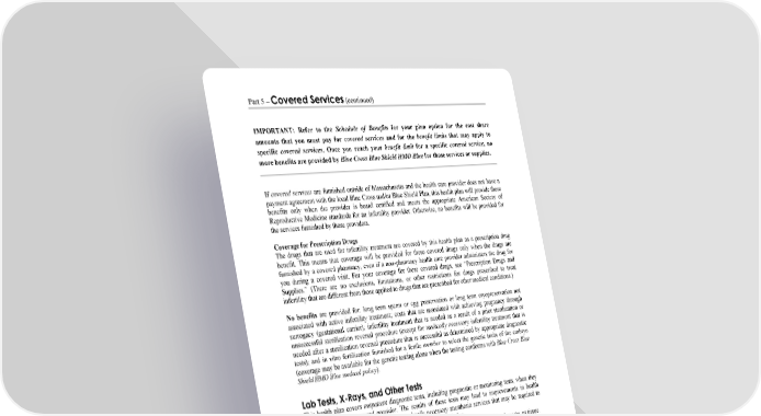 Part 5 – Covered Services (continued) IMPORTANT: Refer to the Schedule of Benefits for your plan option for the cost share amounts that you must pay for covered services and for the benefit limits that may apply to specific covered services. Once you reach your benefit limit for a specific covered service, no more benefits are provided by Blue Cross Blue Shield HMO Blue for those services or supplies. WORDS IN ITALICS ARE EXPLAINED IN PART 2. Page 44 If covered services are furnished outside of Massachusetts and the health care provider does not have a payment agreement with the local Blue Cross and/or Blue Shield Plan, this health plan will provide these benefits only when the provider is board certified and meets the appropriate American Society of Reproductive Medicine standards for an infertility provider. Otherwise, no benefits will be provided for the services furnished by those providers. Coverage for Prescription Drugs The drugs that are used for infertility treatment are covered by this health plan as a prescription drug benefit. This means that coverage will be provided for these covered drugs only when the drugs are furnished by a covered pharmacy, even if a non-pharmacy health care provider administers the drug for you during a covered visit. For your coverage for these covered drugs, see “Prescription Drugs and Supplies.” (There are no exclusions, limitations, or other restrictions for drugs prescribed to treat infertility that are different from those applied to drugs that are prescribed for other medical conditions.) No benefits are provided for: long term sperm or egg preservation or long term cryopreservation not associated with active infertility treatment; costs that are associated with achieving pregnancy through surrogacy (gestational carrier); infertility treatment that is needed as a result of a prior sterilization or unsuccessful sterilization reversal procedure (except for medically necessary infertility treatment that is needed after a sterilization reversal procedure that is successful as determined by appropriate diagnostic tests); and in vitro fertilization furnished for a fertile member to select the genetic traits of the embryo (coverage may be available for the genetic testing alone when the testing conforms with Blue Cross Blue Shield HMO Blue medical policy). Lab Tests, X-Rays, and Other Tests This health plan covers outpatient diagnostic tests, including prognostic or monitoring tests, when they are furnished by a covered provider. The results of these tests may lead to improvements in health outcomes. This health plan also covers medically necessary anesthesia services that may be required to perform covered outpatient diagnostic tests. This coverage includes: Diagnostic lab tests. These tests normally use samples from the body such as blood, waste, or tissue. These tests allow providers to obtain information about a member’s health to help to diagnose or to treat or to prevent disease. Diagnostic x-ray and other imaging tests, when they are not performed as part of a covered surgical admission. These tests provide a radiological image of the internal body. These types of tests can be low-tech radiology services, such as ultrasounds or x-rays. Or, they can be high-tech radiology services, such as computerized axial tomography (CT scans), magnetic resonance imaging (MRI), positron emission tomography (PET scans), and nuclear cardiac imaging. Imaging tests may pair pictures of the body with functional measurements, such as a barium swallow test. Other diagnostic tests not described above. These tests are used: to confirm or diagnose health problems; to monitor a condition; and/or to determine a course of treatment. Some examples of diagnostic tests are: capsule endoscopy; transcranial doppler study; and diagnostic machine tests, such as pulmonary function tests and Holter monitoring.