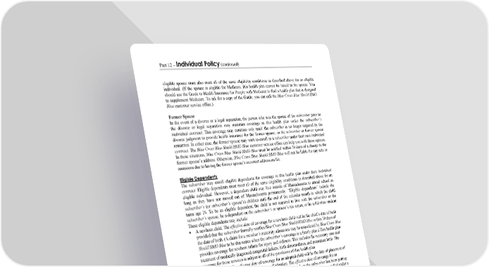 Part 12 – Individual Policy (continued) WORDS IN ITALICS ARE EXPLAINED IN PART 2. Page 105 eligible spouse must also meet all of the same eligibility conditions as described above for an eligible individual. (If the spouse is eligible for Medicare, this health plan cannot be issued to the spouse. You should use the Guide to Health Insurance for People with Medicare to find a health plan that is designed to supplement Medicare. To ask for a copy of the Guide, you can call the Blue Cross Blue Shield HMO Blue customer service office.) Former Spouse In the event of a divorce or a legal separation, the person who was the spouse of the subscriber prior to the divorce or legal separation may maintain coverage in this health plan under the subscriber’s individual contract. This coverage may continue only until: the subscriber is no longer required by the divorce judgment to provide health insurance for the former spouse; or the subscriber or former spouse remarries. In either case, the former spouse may wish to enroll as a subscriber under their own individual contract. The Blue Cross Blue Shield HMO Blue customer service office can help you with these options. In these situations, Blue Cross Blue Shield HMO Blue must be notified within 30 days of a change to the former spouse’s address. Otherwise, Blue Cross Blue Shield HMO Blue will not be liable for any acts or omissions due to having the former spouse’s incorrect address on file. Eligible Dependents The subscriber may enroll eligible dependents for coverage in this health plan under their individual contract. Eligible dependents must meet all of the same eligibility conditions as described above for an eligible individual. However, a dependent child may live outside of Massachusetts to attend school as long as they have not moved out of Massachusetts permanently. “Eligible dependents” include the subscriber’s (or subscriber’s spouse’s) children until the end of the calendar month in which the child turns age 26. To be an eligible dependent, the child is not required to live with the subscriber or the subscriber’s spouse, be a dependent on the subscriber’s or spouse’s tax return, or be a full-time student. These eligible dependents may include: A newborn child. The effective date of coverage for a newborn child will be the child’s date of birth provided that the subscriber formally notifies Blue Cross Blue Shield HMO Blue within 30 days of the date of birth. (A claim for a member’s maternity admission may be considered by Blue Cross Blue Shield HMO Blue to be this notice when the subscriber’s coverage is a family plan.) This health plan provides coverage for newborn infants for injury and sickness. This includes the necessary care and treatment of medically diagnosed congenital defects, birth abnormalities, and premature birth. The coverage for these services is subject to all of the provisions of this health plan. An adopted child. The effective date of coverage for an adopted child will be the date of placement of the child with the subscriber for the purpose of adoption. The effective date of coverage for an adoptive child who has been living with the subscriber and for whom the subscriber has been getting foster care payments will be the date the petition to adopt is filed. If the subscriber is enrolled under a family plan as of the date they assume custody of a child for the purpose of adoption, the child’s health care services for injury or sickness will be covered from the date of custody. (This coverage is provided without a waiting period or pre-existing condition restriction.) This includes the necessary care and treatment of medically diagnosed congenital defects, birth abnormalities, and premature birth. The coverage for these services is subject to all of the provisions of this health plan. A newborn infant of an enrolled dependent child immediately from the moment of birth and continuing after, until the enrolled dependent child is no longer eligible as a dependent. If an eligible dependent child is married, the dependent child can enroll for coverage under the subscriber’s individual contract. And, as long as that enrolled child is an eligible dependent, their children are also eligible for coverage under the subscriber’s individual contract. The dependent child’s spouse is not eligible to enroll as a dependent for coverage under the subscriber’s individual contract.