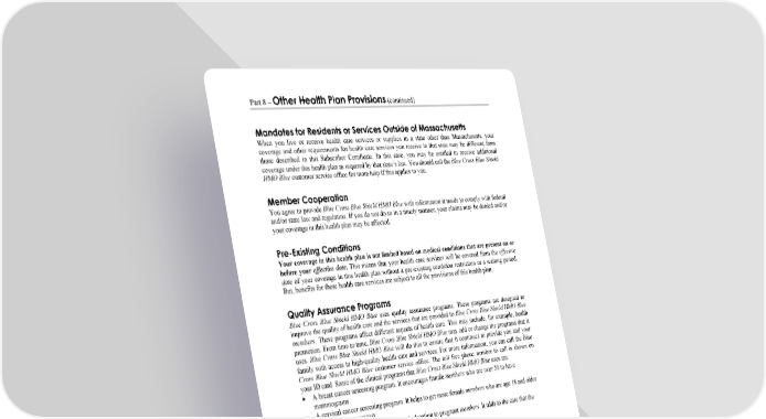 Part 8 – Other Health Plan Provisions (continued) WORDS IN ITALICS ARE EXPLAINED IN PART 2. Page 82 Mandates for Residents or Services Outside of Massachusetts When you live or receive health care services or supplies in a state other than Massachusetts, your coverage and other requirements for health care services you receive in that state may be different from those described in this Subscriber Certificate. In this case, you may be entitled to receive additional coverage under this health plan as required by that state’s law. You should call the Blue Cross Blue Shield HMO Blue customer service office for more help if this applies to you. Member Cooperation You agree to provide Blue Cross Blue Shield HMO Blue with information it needs to comply with federal and/or state law and regulation. If you do not do so in a timely manner, your claims may be denied and/or your coverage in this health plan may be affected. Pre-Existing Conditions Your coverage in this health plan is not limited based on medical conditions that are present on or before your effective date. This means that your health care services will be covered from the effective date of your coverage in this health plan without a pre-existing condition restriction or a waiting period. But, benefits for these health care services are subject to all the provisions of this health plan. Quality Assurance Programs Blue Cross Blue Shield HMO Blue uses quality assurance programs. These programs are designed to improve the quality of health care and the services that are provided to Blue Cross Blue Shield HMO Blue members. These programs affect different aspects of health care. This may include, for example, health promotion. From time to time, Blue Cross Blue Shield HMO Blue may add or change the programs that it uses. Blue Cross Blue Shield HMO Blue will do this to ensure that it continues to provide you and your family with access to high-quality health care and services. For more information, you can call the Blue Cross Blue Shield HMO Blue customer service office. The toll free phone number to call is shown on your ID card. Some of the clinical programs that Blue Cross Blue Shield HMO Blue uses are: A breast cancer screening program. It encourages female members who are over 50 to have mammograms. A cervical cancer screening program. It helps to get more female members who are age 18 and older to have a Pap smear test. A program that furnishes outreach and education to pregnant members. It adds to the care that the member gets from an obstetrician or nurse midwife. A program that promotes timely postnatal checkups. Diabetes management and education. This helps diabetic members to self-manage their diabetes. It also helps to identify high-risk members and helps to assess their ongoing needs. Congestive heart failure disease management, education, and monitoring.