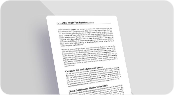 Part 8 – Other Health Plan Provisions (continued) WORDS IN ITALICS ARE EXPLAINED IN PART 2. Page 80 certain covered services such as your copayment or your deductible or your coinsurance. When Blue Cross Blue Shield HMO Blue makes a material change to your coverage in this health plan, Blue Cross Blue Shield HMO Blue will send a notice about the change at least 60 days before the effective date of the change. The notice will be sent to the subscriber or, when you are enrolled in this health plan as a group member, to the plan sponsor. The notice from Blue Cross Blue Shield HMO Blue will describe the change being made. It will also give the effective date of the change. If you are enrolled as a group member, the plan sponsor should deliver to its group members all notices from Blue Cross Blue Shield HMO Blue. (If you enrolled in this health plan through the Massachusetts Health Connector, see Part 11 or Part 12, whichever applies to you, for information.) There may be times when the provisions of your coverage in this health plan change but Blue Cross Blue Shield HMO Blue is not able to provide prior notice of the change as described above. These changes may be made by Blue Cross Blue Shield HMO Blue as a result of events beyond its control such as: war; riot; national emergency; terrorist attack; public health emergency; pandemic; or natural disaster. When this happens, Blue Cross Blue Shield HMO Blue will make a determination to provide services under this health plan based on the severity of the event and the needs of its members enrolled under this health plan during this time. For example, Blue Cross Blue Shield HMO Blue may temporarily eliminate the cost share amount that you must pay for certain covered services such as your copayment or your deductible or your coinsurance. Charges for Non-Medically Necessary Services You may receive health care services that would otherwise be covered by this health plan, except that these services are not determined to be medically necessary for you by Blue Cross Blue Shield HMO Blue. This health plan does not cover health care services or supplies that are not medically necessary for you. If you receive care that is not medically necessary for you, you might be charged for the care by the health care provider. A provider who has a payment agreement with Blue Cross Blue Shield HMO Blue has agreed not to charge you for services that are not medically necessary, unless you were told, knew, or reasonably should have known before you received this treatment that it was not medically necessary. Clinical Guidelines and Utilization Review Criteria Blue Cross Blue Shield HMO Blue applies medical technology assessment criteria and medical necessity guidelines when it develops its clinical guidelines, utilization review criteria, and medical policies. Blue Cross Blue Shield HMO Blue reviews its clinical guidelines, utilization review criteria, and medical policies from time to time. Blue Cross Blue Shield HMO Blue does this to reflect new treatments, applications, and technologies. For example, when a new drug is approved by the U.S. Food and Drug Administration (FDA), Blue Cross Blue Shield HMO Blue reviews its safety, effectiveness, and overall value on an ongoing basis. While a new treatment, technology, or drug is being reviewed, it will not be covered by this health plan. Another example is when services and supplies are approved by the U.S. Food and Drug Administration (FDA) for the diagnosis and treatment of insulin dependent, insulin using, gestational, or non-insulin dependent diabetes. In this case, coverage will be provided for those services or supplies as long as they can be classified under a category of covered services.