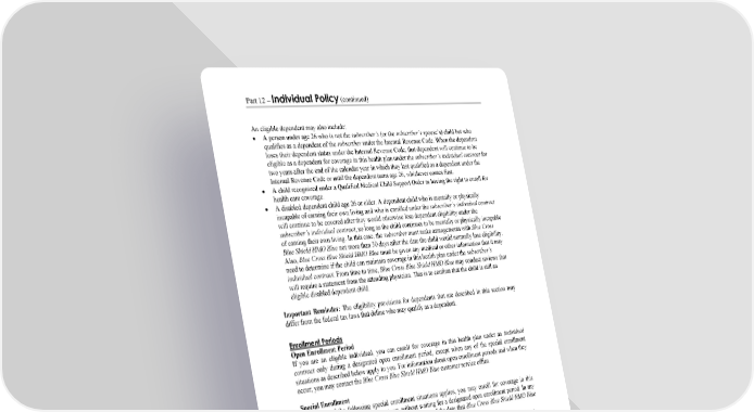 Part 12 – Individual Policy (continued) WORDS IN ITALICS ARE EXPLAINED IN PART 2. Page 106 An eligible dependent may also include: A person under age 26 who is not the subscriber’s (or the subscriber’s spouse’s) child but who qualifies as a dependent of the subscriber under the Internal Revenue Code. When the dependent loses their dependent status under the Internal Revenue Code, that dependent will continue to be eligible as a dependent for coverage in this health plan under the subscriber’s individual contract for two years after the end of the calendar year in which they last qualified as a dependent under the Internal Revenue Code or until the dependent turns age 26, whichever comes first. A child recognized under a Qualified Medical Child Support Order as having the right to enroll for health care coverage. A disabled dependent child age 26 or older. A dependent child who is mentally or physically incapable of earning their own living and who is enrolled under the subscriber’s individual contract will continue to be covered after they would otherwise lose dependent eligibility under the subscriber’s individual contract, so long as the child continues to be mentally or physically incapable of earning their own living. In this case, the subscriber must make arrangements with Blue Cross Blue Shield HMO Blue not more than 30 days after the date the child would normally lose eligibility. Also, Blue Cross Blue Shield HMO Blue must be given any medical or other information that it may need to determine if the child can maintain coverage in this health plan under the subscriber’s individual contract. From time to time, Blue Cross Blue Shield HMO Blue may conduct reviews that will require a statement from the attending physician. This is to confirm that the child is still an eligible disabled dependent child. Important Reminder: The eligibility provisions for dependents that are described in this section may differ from the federal tax laws that define who may qualify as a dependent. Enrollment Periods Open Enrollment Period If you are an eligible individual, you can enroll for coverage in this health plan under an individual contract only during a designated open enrollment period, except when any of the special enrollment situations as described below apply to you. For information about open enrollment periods and when they occur, you may contact the Blue Cross Blue Shield HMO Blue customer service office. Special Enrollment If any one of the following special enrollment situations applies, you may enroll for coverage in this health plan under an individual contract, without waiting for a designated open enrollment period. In any of these situations, you will be enrolled within 30 days of the date that Blue Cross Blue Shield HMO Blue receives your completed enrollment form. You had prior creditable health care coverage. Blue Cross Blue Shield HMO Blue must receive your enrollment request within 63 days of the termination date of the prior health care coverage. You have a qualifying event, including (but not limited to): marriage; birth or adoption of a child; court-ordered care of a child; loss of coverage as a dependent under a group or government health plan; or any other event as may be designated by the Commissioner of Insurance. Blue Cross Blue Shield HMO Blue must receive your enrollment request within 63 days of the event or within 30 days of the event if coverage is for an eligible dependent. You have been granted a waiver by the Office of Patient Protection to enroll outside of the open enrollment period. Enrollment Process To apply for coverage in this health plan under an individual contract, you must complete an enrollment application. Send your completed application to Blue Cross Blue Shield HMO Blue. You must also send