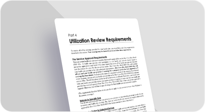 WORDS IN ITALICS ARE EXPLAINED IN PART 2. Page 27 Part 4 Utilization Review Requirements To receive all of the coverage provided by your health plan, you must follow all of the requirements described in this section. Your coverage may be denied if you do not follow these requirements. Pre-Service Approval Requirements There are certain health care services or supplies that must be approved for you by Blue Cross Blue Shield HMO Blue. A health care provider who participates in your health care network should request a pre-service approval on your behalf. (You must request this review if the health care provider does not start the process for you.) For the pre-service review, Blue Cross Blue Shield HMO Blue will consider your health care provider to be your authorized representative. Blue Cross Blue Shield HMO Blue will tell you and your health care provider if coverage for a proposed service has been approved or if coverage has been denied. To check on the status of a request or to check for the outcome of a utilization review decision, you can call your health care provider or the Blue Cross Blue Shield HMO Blue customer service office. The toll free phone number to call is shown on your ID card. Remember, you should check with your health care provider before you receive services or supplies to make sure that your health care provider has received approval from Blue Cross Blue Shield HMO Blue when a pre-service approval is required. Otherwise, you will have to pay all charges for those health care services and/or supplies. (The requirements described below in this part do not apply to your covered services when Medicare is the primary coverage.) Referrals for Specialty Care You do not need a referral from your primary care provider or your attending physician in order for you to receive your health plan coverage. But, there are certain health care services and supplies that must be approved by Blue Cross Blue Shield HMO Blue before you receive them. (See below.) Pre-Service Review for Outpatient Services To receive all of your coverage for certain outpatient health services and supplies, you must obtain a pre-service approval from Blue Cross Blue Shield HMO Blue. A provider who participates in your health care network will request this approval on your behalf. During the pre-service review, Blue Cross Blue Shield HMO Blue will determine if your proposed health care services or supplies should be covered as medically necessary for your condition. Blue Cross Blue Shield HMO Blue will make this decision within two working days of the date that it receives all of the needed information from your health care provider. You must receive a pre-service approval from Blue Cross Blue Shield HMO Blue for: Certain outpatient specialty care, procedures, services, and supplies. Some examples of services that may require prior approval include: some types of surgery; non-emergency ground ambulance; and certain outpatient treatment plans that require a review due to factors such as (but not limited to) the variability in length of treatment, the difficulty in predicting a standard length of treatment, the risk factors and provider discretion in determining treatment intensity compared to symptoms, the difficulty in measuring outcomes, or the variability in cost and quality. To find out if a treatment, service, or supply needs a pre-service review, you can check with your health care provider. You can also find out by calling the Blue Cross Blue Shield HMO Blue customer service office or using the online Blue Cross Blue Shield HMO Blue member self service option. To check online,