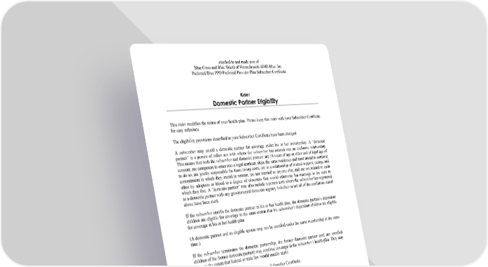 attached to and made part of Blue Cross and Blue Shield of Massachusetts HMO Blue, Inc. Preferred Blue PPO Preferred Provider Plan Subscriber Certificate R12-017 (2015 Rev.) to be attached to HMO-PPO Page 1 hppo12-017 Rider Domestic Partner Eligibility This rider modifies the terms of your health plan. Please keep this rider with your Subscriber Certificate for easy reference. The eligibility provisions described in your Subscriber Certificate have been changed. A subscriber may enroll a domestic partner for coverage under his or her membership. A “domestic partner” is a person of either sex with whom the subscriber has entered into an exclusive relationship. This means that both the subscriber and domestic partner: are 18 years of age or older and of legal age of consent; are competent to enter into a legal contract; share the same residence and must intend to continue to do so; are jointly responsible for basic living costs; are in a relationship of mutual support, caring, and commitment in which they intend to remain; are not married to anyone else; and are not related to each other by adoption or blood to a degree of closeness that would otherwise bar marriage in the state in which they live. A “domestic partner” may also include a person with whom the subscriber has registered as a domestic partner with any governmental domestic registry (whether or not all of the conditions stated above have been met). If the subscriber enrolls the domestic partner in his or her health plan, the domestic partner’s dependent children are eligible for coverage to the same extent that the subscriber’s dependent children are eligible for coverage in his or her health plan. (A domestic partner and an eligible spouse may not be enrolled under the same membership at the same time.) If the subscriber terminates the domestic partnership, the former domestic partner (and any enrolled children of the former domestic partner) may continue coverage in the subscriber’s health plan. They may do so to the extent that federal or state law would usually apply. All other provisions remain as described in your Subscriber Certificate.