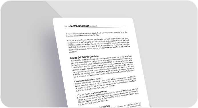 Part 1 – Member Services (continued) WORDS IN ITALICS ARE EXPLAINED IN PART 2. Page 4 deductible and out-of-pocket maximum amounts. It will also include contact information for the Blue Cross Blue Shield HMO Blue customer service office. While you are a member, you must show your ID card to your health care provider before you receive covered services. If you lose your ID card or it is stolen, you should contact the Blue Cross Blue Shield HMO Blue customer service office. They will send you a new card. Or, you can use the Blue Cross Blue Shield HMO Blue Web site to ask for a new ID card. To use the Blue Cross Blue Shield HMO Blue online member self service option, you must log on to www.bluecrossma.org. Just follow the steps to ask for a new ID card. How to Get Help for Questions Blue Cross Blue Shield HMO Blue can help you to understand the terms of your coverage in this health plan. They can also help you to resolve a problem or concern that you may have about your health care benefits. You can call or write to the Blue Cross Blue Shield HMO Blue customer service office. A Blue Cross Blue Shield HMO Blue customer service representative will work with you to resolve your problem or concern as quickly as possible. Blue Cross Blue Shield HMO Blue will keep a record of each inquiry you, or someone on your behalf, makes to Blue Cross Blue Shield HMO Blue. Blue Cross Blue Shield HMO Blue will keep these records, including the answers to each inquiry, for two years. These records may be reviewed by the Commissioner of Insurance and the Massachusetts Department of Public Health. If You Are Enrolled as a Group Member If you are enrolled in this health plan as a group member under a group contract, you can call Monday through Friday from 8:00 a.m. to 8:00 p.m. (Eastern Time). The toll free phone number to call is shown on your ID card. (For TTY, call 711.) Or, you can write to: Blue Cross Blue Shield of Massachusetts, Member Service, P.O. Box 9134, North Quincy, MA 02171-9134. If You Are Enrolled as an Individual Member If you enrolled in this health plan under an individual contract, you can call Monday through Friday from 8:00 a.m. to 6:00 p.m. (Eastern Time). The toll free phone number to call is shown on your ID card. (For TTY, call 711.) Or, you can write to: Blue Cross Blue Shield of Massachusetts, Member Service, P.O. Box 9140, North Quincy, MA 02171-9140. Discrimination Is Against the Law Blue Cross Blue Shield HMO Blue complies with applicable federal civil rights laws and does not discriminate on the basis of race; color; national origin; age; disability; sex; sexual orientation; or gender identity. Blue Cross Blue Shield HMO Blue does not exclude people or treat them differently because of race; color; national origin; age; disability; sex; sexual orientation; or gender identity. Blue Cross Blue Shield HMO Blue provides: Free aids and services to people with disabilities to communicate effectively with Blue Cross Blue Shield HMO Blue. These aids and services may include qualified sign language interpreters and written information in other formats (such as in large print). Free language services to people whose primary language is not English, such as qualified interpreters and information written in other languages. If you need these services, call the Blue Cross Blue Shield HMO Blue customer service office. The toll free phone number to call is shown on your ID card.
