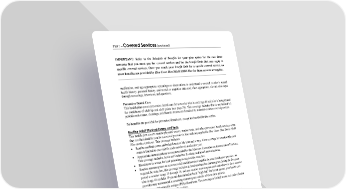 Part 5 – Covered Services (continued) IMPORTANT: Refer to the Schedule of Benefits for your plan option for the cost share amounts that you must pay for covered services and for the benefit limits that may apply to specific covered services. Once you reach your benefit limit for a specific covered service, no more benefits are provided by Blue Cross Blue Shield HMO Blue for those services or supplies. WORDS IN ITALICS ARE EXPLAINED IN PART 2. Page 60 medication; and age-appropriate screenings or observations to understand a covered member’s mental health history, personal history, and mental or cognitive state and, when appropriate, relevant adult input through screenings, interviews, and questions. Preventive Dental Care This health plan covers preventive dental care for a member who is under age 18 and who is being treated for conditions of cleft lip and cleft palate (see page 38). This coverage includes (but is not limited to) periodic oral exams, cleanings, and fluoride treatments furnished by a dentist or other covered provider. No benefits are provided for preventive dental care, except as described in this section. Routine Adult Physical Exams and Tests This health plan covers routine physical exams, routine tests, and other preventive health services when they are furnished for you by a covered provider in line with any applicable Blue Cross Blue Shield HMO Blue medical policies. This coverage includes: Routine medical exams and related routine lab tests and x-rays. Your coverage for a routine physical exam is limited to one visit for each member in a calendar year. Appropriate immunizations as recommended by the Advisory Committee on Immunization Practices. This coverage includes, but is not limited to: flu shots; and travel immunizations. Blood tests to screen for lead poisoning as required by state law. Routine mammograms as recommended and determined suitable by your health care provider. As required by state law, this coverage includes at least one baseline mammogram during the five-year period a member is age 35 through 39; and one routine mammogram each calendar year for a member who is age 40 or older. If you are determined to be at “high risk” for breast cancer, your health care provider may recommend a screening mammogram outside of these time periods. Routine prostate-specific antigen (PSA) blood tests. This coverage is limited to one test each calendar year for a member who is age 40 or older. Routine sigmoidoscopies and barium enemas. Routine colonoscopies. Preventive health services and screenings as recommended by the U.S. Preventive Services Task Force and the U.S. Department of Health and Human Services. Diabetes prevention programs for members who have been diagnosed with pre-diabetes. The goal of these programs is to improve health and decrease the rate of progression to non-insulin dependent diabetes through structured health behavior changes, such as: dietary education; increased physical activity; and weight loss strategies. This coverage for diabetes prevention programs is limited to a lifetime benefit limit of one program for each eligible member. Other routine services furnished in line with Blue Cross Blue Shield HMO Blue medical policies. Important Note: You have the right to full in-network coverage (provided the services are furnished by a preferred provider) for preventive health services as required by the Affordable Care Act and related regulations. For a complete description of these preventive health services, you can call the Blue Cross Blue Shield HMO Blue customer service office. The toll free phone number to call is shown on your ID