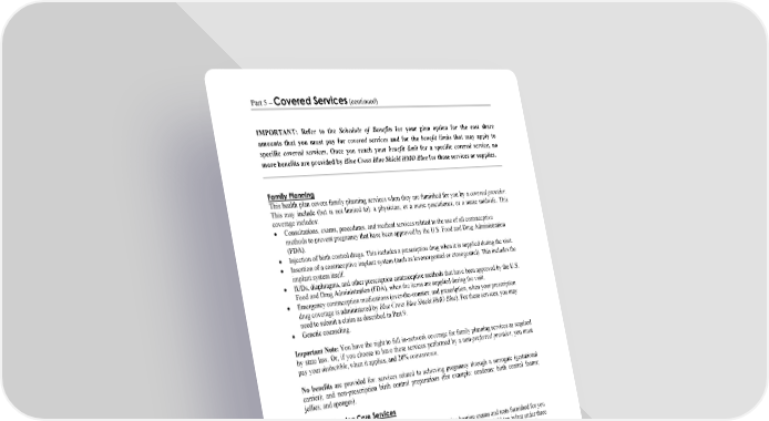 Part 5 – Covered Services (continued) IMPORTANT: Refer to the Schedule of Benefits for your plan option for the cost share amounts that you must pay for covered services and for the benefit limits that may apply to specific covered services. Once you reach your benefit limit for a specific covered service, no more benefits are provided by Blue Cross Blue Shield HMO Blue for those services or supplies. WORDS IN ITALICS ARE EXPLAINED IN PART 2. Page 62 Family Planning This health plan covers family planning services when they are furnished for you by a covered provider. This may include (but is not limited to): a physician; or a nurse practitioner; or a nurse midwife. This coverage includes: Consultations, exams, procedures, and medical services related to the use of all contraceptive methods to prevent pregnancy that have been approved by the U.S. Food and Drug Administration (FDA). Injection of birth control drugs. This includes a prescription drug when it is supplied during the visit. Insertion of a contraceptive implant system (such as levonorgestrel or etonogestrel). This includes the implant system itself. IUDs, diaphragms, and other prescription contraceptive methods that have been approved by the U.S. Food and Drug Administration (FDA), when the items are supplied during the visit. Emergency contraception medications (over-the-counter; and prescription, when your prescription drug coverage is administered by Blue Cross Blue Shield HMO Blue). For these services, you may need to submit a claim as described in Part 9. Genetic counseling. Important Note: You have the right to full in-network coverage for family planning services as required by state law. Or, if you choose to have these services performed by a non-preferred provider, you must pay your deductible, when it applies, and 20% coinsurance. No benefits are provided for: services related to achieving pregnancy through a surrogate (gestational carrier); and non-prescription birth control preparations (for example: condoms; birth control foams; jellies; and sponges). Routine Hearing Care Services This health plan covers: Routine Hearing Exams and Tests. This includes routine hearing exams and tests furnished for you by a covered provider and newborn hearing screening tests for a newborn child (an infant under three months of age) as provided by regulations of the Massachusetts Department of Public Health. (See “Well Newborn Care” for your inpatient coverage for newborn hearing screening tests.) Hearing Aids and Related Services. This includes hearing aids and covered services related to a covered hearing aid when the covered services are furnished by a covered provider, such as a licensed audiologist or licensed hearing instrument specialist. These covered services include: the initial hearing aid evaluation; one hearing aid for each hearing-impaired ear; fitting and adjustments of the hearing aid; and supplies such as (but not limited to) ear molds. No benefits are provided for replacement hearing aid batteries. The Schedule of Benefits for your plan option describes the benefit limit that applies for hearing aids—this means any age restriction, dollar benefit maximum for the hearing aid device itself, and/or eligible time period during which hearing aids and related services will be covered by your health plan. (Also refer to riders—if there are any—that apply to your coverage in this health plan.) If you choose a hearing aid device that costs more than your benefit limit, you will have to pay the balance of the cost of the device that is in excess of the benefit limit.