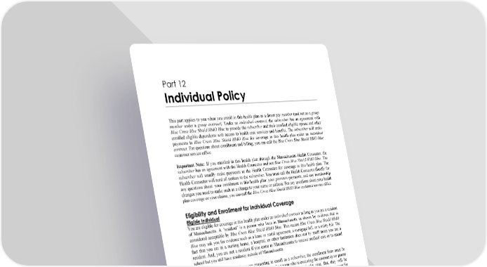 WORDS IN ITALICS ARE EXPLAINED IN PART 2. Page 104 Part 12 Individual Policy This part applies to you when you enroll in this health plan as a direct pay member (and not as a group member under a group contract). Under an individual contract, the subscriber has an agreement with Blue Cross Blue Shield HMO Blue to provide the subscriber and their enrolled eligible spouse and other enrolled eligible dependents with access to health care services and benefits. The subscriber will make payments to Blue Cross Blue Shield HMO Blue for coverage in this health plan under an individual contract. For questions about enrollment and billing, you can call the Blue Cross Blue Shield HMO Blue customer service office. Important Note: If you enrolled in this health plan through the Massachusetts Health Connector, the subscriber has an agreement with the Health Connector and not Blue Cross Blue Shield HMO Blue. The subscriber will usually make payments to the Health Connector for coverage in this health plan. The Health Connector will send all notices to the subscriber. You must call the Health Connector directly for any questions about: your enrollment in this health plan; your premium payments; and any membership changes you need to make such as a change to your name or address. For any questions about your health plan coverage or your claims, you can call the Blue Cross Blue Shield HMO Blue customer service office. Eligibility and Enrollment for Individual Coverage Eligible Individual You are eligible for coverage in this health plan under an individual contract as long as you are a resident of Massachusetts. A “resident” is a person who lives in Massachusetts as shown by evidence that is considered acceptable by Blue Cross Blue Shield HMO Blue. This means Blue Cross Blue Shield HMO Blue may ask you for evidence such as a lease or rental agreement, a mortgage bill, or a utility bill. The fact that you are in a nursing home, a hospital, or other institution does not by itself mean you are a resident. And, you are not a resident if you come to Massachusetts to receive medical care or to attend school but you still have residency outside of Massachusetts. If you are under age 18 and you are requesting to enroll as a subscriber, the enrollment form must be completed by your parent or guardian. In this case, the person who is executing the contract (your parent or guardian) is not eligible for benefits under your coverage in this health plan. But, they will be responsible for acting on behalf of the subscriber as necessary and for paying the monthly premium for your coverage. The person who executes the contract will be considered your authorized representative. This health plan is not a Medicare supplement plan. If you are eligible for Medicare, this health plan cannot be issued to you. You should look at the Guide to Health Insurance for People with Medicare. You may be able to sign up for a health plan that is designed to supplement Medicare. To ask for a copy of the Guide, you can call the Blue Cross Blue Shield HMO Blue customer service office. (See Part 1.) If you are already enrolled in this health plan when you become eligible for Medicare, you may choose to stay enrolled. If you choose to remain enrolled, Medicare may provide coverage for the same health care services that are covered by this health plan. In this case, Medicare is the primary payor. Eligible Spouse The subscriber may enroll an eligible spouse for coverage in this health plan under their individual contract. An “eligible spouse” includes the subscriber’s legal spouse or legal civil union spouse. An