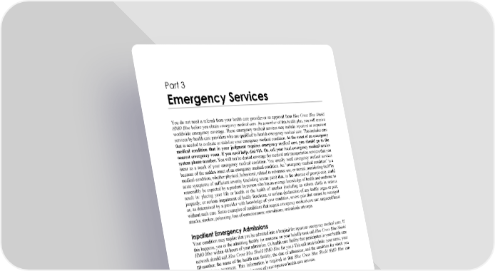 WORDS IN ITALICS ARE EXPLAINED IN PART 2. Page 25 Part 3 Emergency Services You do not need a referral from your health care provider or an approval from Blue Cross Blue Shield HMO Blue before you obtain emergency medical care. As a member of this health plan, you will receive worldwide emergency coverage. These emergency medical services may include inpatient or outpatient services by health care providers who are qualified to furnish emergency medical care. This includes care that is needed to evaluate or stabilize your emergency medical condition. At the onset of an emergency medical condition that in your judgment requires emergency medical care, you should go to the nearest emergency room. If you need help, dial 911. Or, call your local emergency medical service system phone number. You will not be denied coverage for medical and transportation services that you incur as a result of your emergency medical condition. You usually need emergency medical services because of the sudden onset of an emergency medical condition. An “emergency medical condition” is a medical condition, whether physical, behavioral, related to substance use, or mental, manifesting itself by acute symptoms of sufficient severity (including severe pain) that, in the absence of prompt care, could reasonably be expected by a prudent layperson who has an average knowledge of health and medicine to result in: placing your life or health or the health of another (including an unborn child) in serious jeopardy; or serious impairment of bodily functions; or serious dysfunction of any bodily organ or part; or, as determined by a provider with knowledge of your condition, severe pain that cannot be managed without such care. Some examples of conditions that require emergency medical care are: suspected heart attacks; strokes; poisoning; loss of consciousness; convulsions; and suicide attempts. Inpatient Emergency Admissions Your condition may require that you be admitted into a hospital for inpatient emergency medical care. If this happens, you or the admitting facility (or someone on your behalf) must call Blue Cross Blue Shield HMO Blue within 48 hours of your admission. (A health care facility that participates in your health care network should call Blue Cross Blue Shield HMO Blue for you.) This call must include: your name; your ID number; the name of the health care facility; the date of admission; and the condition for which you are receiving treatment. This information is required so that Blue Cross Blue Shield HMO Blue can evaluate and monitor the appropriateness of your inpatient health care services. Outpatient Emergency Services When you have an emergency medical condition, you should receive care at the nearest emergency room. If you receive emergency medical care at an emergency room of a hospital that does not participate in your health care network, your health plan will provide the same coverage that you would otherwise receive if you had gone to a hospital that does participate in your health care network. Post-Stabilization Care After your emergency medical condition has been evaluated and stabilized in the hospital emergency room, you may be ready to go home. Or, you may require further care. Blue Cross Blue Shield HMO Blue will consider post-stabilization covered services to be approved if an approval is not given within 30 minutes of the emergency room provider’s call. If the emergency room provider and your health care provider do not agree as to the right medical treatment for you, your health plan will cover the health care