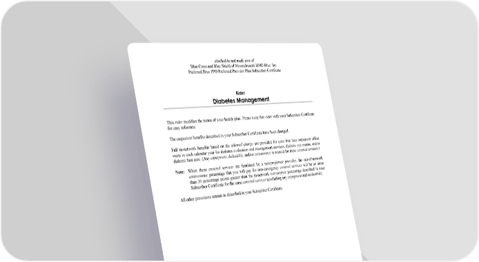 attached to and made part of Blue Cross and Blue Shield of Massachusetts HMO Blue, Inc. Preferred Blue PPO Preferred Provider Plan Subscriber Certificate R02-397 (2016 Rev.) to be attached to HMO-PPO Page 1 hppo02-397 Rider Diabetes Management This rider modifies the terms of your health plan. Please keep this rider with your Subscriber Certificate for easy reference. The outpatient benefits described in your Subscriber Certificate have been changed. Full in-network benefits based on the allowed charge are provided for your first two outpatient office visits in each calendar year for diabetes evaluation and management services, diabetic eye exams, and/or diabetic foot care. (Any copayment, deductible, and/or coinsurance is waived for these covered services.) Note: When these covered services are furnished by a non-preferred provider, the out-of-network coinsurance percentage that you will pay for non-emergency covered services will be no more than 20 percentage points greater than the in-network coinsurance percentage described in your Subscriber Certificate for the same covered services (excluding any copayment and deductible). All other provisions remain as described in your Subscriber Certificate.