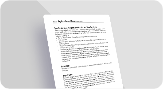 Part 2 – Explanation of Terms (continued) WORDS IN ITALICS ARE EXPLAINED IN PART 2. Page 23 Special Services (Hospital and Facility Ancillary Services) When you receive health care services from a hospital or other covered health care facility, covered services include certain services and supplies that the health care facility normally furnishes to its patients for diagnosis or treatment while the patient is in the facility. These special services include (but are not limited to) such things as: The use of special rooms. These include: operating rooms; and treatment rooms. Tests and exams. The use of special equipment in the facility. Also, the services of the people hired by the facility to run the equipment. Drugs, medications, solutions, biological preparations, and medical and surgical supplies that are used while you are in the facility. Administration of infusions and transfusions and blood processing fees. These do not include the cost of: whole blood; packed red blood cells; blood donor fees; or blood storage fees. Internal prostheses (artificial replacements of parts of the body) that are part of an operation. These include things such as: hip joints; skull plates; intraocular lenses that are implanted after corneal transplant, cataract surgery, or other covered eye surgery, when the natural eye lens is replaced; and pacemakers. They do not include things such as: ostomy bags; artificial limbs or eyes; hearing aids; or airplane splints. Subscriber The subscriber is the eligible person who signs the enrollment form at the time of enrollment in this health plan. Urgent Care This health plan provides coverage for urgent care. This is medical, surgical, or psychiatric care, other than emergency medical care, that you need right away. This is care that you need to prevent serious deterioration of your health when an unforeseen illness or injury occurs. In most cases, urgent care will be brief diagnostic care and treatment to stabilize your condition. (For purposes of filing a claim or a formal appeal or grievance review, Blue Cross Blue Shield HMO Blue considers “emergency medical care” to constitute “urgent care” as defined under the Employee Retirement Income Security Act of 1974, as amended (ERISA). As used in this Subscriber Certificate, this urgent care term is not the same as the “urgent care” term defined under ERISA.) Utilization Review This term refers to the programs that Blue Cross Blue Shield HMO Blue uses to evaluate the necessity and appropriateness of your health care services and supplies. Blue Cross Blue Shield HMO Blue uses a set of formal techniques that are designed to monitor the use of, or evaluate the clinical necessity, appropriateness, efficacy or efficiency of health care services, procedures or settings, and drugs. These programs are designed to encourage appropriate care and services (not less care). Blue Cross Blue Shield HMO Blue understands the need for concern about underutilization. Blue Cross Blue Shield HMO Blue shares this concern with its members and health care providers. Blue Cross Blue Shield HMO Blue does not compensate individuals who conduct utilization review activities based on denials. Blue Cross Blue Shield HMO Blue also does not offer incentives to health care providers to encourage inappropriate denials of care and services. These programs may include any or all of the following: Pre-admission review, concurrent review, and discharge planning. Pre-approval of some outpatient services, including drugs (whether the drugs are furnished to you by a health care provider along with a covered service or by a pharmacy).