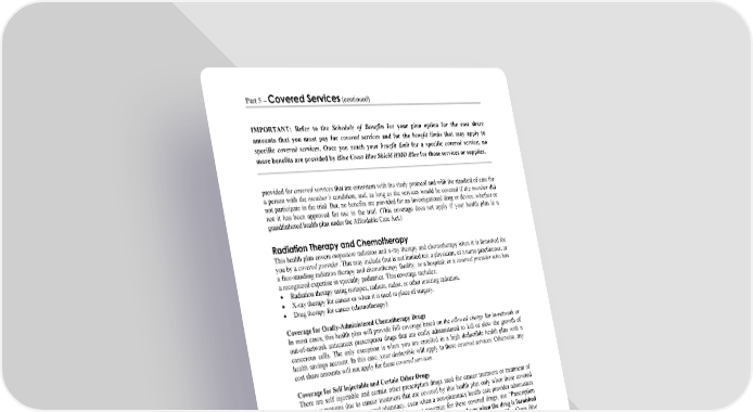 Part 5 – Covered Services (continued) IMPORTANT: Refer to the Schedule of Benefits for your plan option for the cost share amounts that you must pay for covered services and for the benefit limits that may apply to specific covered services. Once you reach your benefit limit for a specific covered service, no more benefits are provided by Blue Cross Blue Shield HMO Blue for those services or supplies. WORDS IN ITALICS ARE EXPLAINED IN PART 2. Page 65 provided for covered services that are consistent with the study protocol and with the standard of care for a person with the member’s condition; and, as long as the services would be covered if the member did not participate in the trial. But, no benefits are provided for an investigational drug or device, whether or not it has been approved for use in the trial. (This coverage does not apply if your health plan is a grandfathered health plan under the Affordable Care Act.) Radiation Therapy and Chemotherapy This health plan covers outpatient radiation and x-ray therapy and chemotherapy when it is furnished for you by a covered provider. This may include (but is not limited to): a physician; or a nurse practitioner; or a free-standing radiation therapy and chemotherapy facility; or a hospital; or a covered provider who has a recognized expertise in specialty pediatrics. This coverage includes: Radiation therapy using isotopes, radium, radon, or other ionizing radiation. X-ray therapy for cancer or when it is used in place of surgery. Drug therapy for cancer (chemotherapy). Coverage for Orally-Administered Chemotherapy Drugs In most cases, this health plan will provide full coverage based on the allowed charge for in-network or out-of-network anticancer prescription drugs that are orally administered to kill or slow the growth of cancerous cells. The only exception is when you are enrolled in a high deductible health plan with a health savings account. In this case, your deductible will apply to these covered services. Otherwise, any cost share amounts will not apply for these covered services. Coverage for Self Injectable and Certain Other Drugs There are self injectable and certain other prescription drugs used for cancer treatment or treatment of cancer symptoms due to cancer treatment that are covered by this health plan only when these covered drugs are furnished by a covered pharmacy, even when a non-pharmacy health care provider administers the drug for you during a covered visit. For your coverage for these covered drugs, see “Prescription Drugs and Supplies.” No benefits are provided for the cost of these drugs when the drug is furnished by a non-pharmacy health care provider. For a list of these drugs, you can call the Blue Cross Blue Shield HMO Blue customer service office. Or, you can log on to the Blue Cross Blue Shield HMO Blue Web site at www.bluecrossma.org. Second Opinions This health plan covers an outpatient second opinion when it is furnished for you by a physician. This coverage includes a third opinion when the second opinion differs from the first. (See “Lab Tests, X-Rays, and Other Tests” for your coverage for related diagnostic tests.) Short-Term Rehabilitation Therapy This health plan covers medically necessary outpatient short-term rehabilitation therapy when it is furnished for you by a covered provider. This may include (but is not limited to): a physical therapist; or an occupational therapist; or a licensed speech-language pathologist; or a covered provider who has a