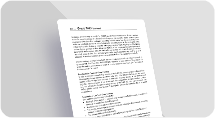 Part 11 – Group Policy (continued) WORDS IN ITALICS ARE EXPLAINED IN PART 2. Page 102 to continue group coverage as provided by COBRA or under Massachusetts state law. A retired employee and/or the surviving spouse of a deceased retired employee may enroll for lifetime continued group coverage as of the date of the bankruptcy proceeding, provided that the loss of group eligibility occurs within one year before the date on which the bankruptcy proceeding begins. Or, if group eligibility is lost within one year after the date on which the bankruptcy proceeding begins, they may enroll for lifetime continued group coverage as of the date group eligibility is lost. Spouses and/or eligible dependents of these retired employees may enroll for continued group coverage until the retired employee dies. Once the retired employee dies, their surviving spouse and/or eligible dependents may enroll for up to an additional 36 months of continued group coverage beyond the date of the retired employee’s death. Lifetime continued coverage in this health plan for retired employees will end if the group cancels its agreement with Blue Cross Blue Shield HMO Blue to provide its group members with coverage in this health plan under a group contract or for any of the other reasons described below. (See “Termination of Continued Group Coverage.”) Enrollment for Continued Group Coverage In order to enroll for continued group coverage in this health plan, you must complete an Election Form. The completed election form must be returned to the office at the address on the form. The form must be returned within 60 days from your date of termination of group coverage or your notification of eligibility, whichever is later. If you do not return the completed form, it will be considered a waiver. And, you will not be allowed to continue coverage in this health plan under a group contract. (The 60 days will be counted from the date of the eligibility notice to the postmarked date of the mailed election form.) Termination of Continued Group Coverage Your continued group coverage will end when: The length of time allowed for continued group coverage is reached (for example, 18 months or 29 months or 36 months from the qualifying event). You fail to make timely payment of your premiums. You enroll in another employer sponsored health plan and that plan does not include pre-existing condition limitations or waiting periods. You become entitled to Medicare benefits. You are no longer disabled (if your continued group coverage had been extended because of disability.) The group terminates its agreement with Blue Cross Blue Shield HMO Blue (or the Massachusetts Health Connector) to provide its group members with access to health care services and benefits under this health plan. In this case, health care coverage may continue under another health plan. Contact your plan sponsor or Blue Cross Blue Shield HMO Blue for more information. Medicare Program When you are eligible for Medicare and Medicare is allowed by federal law to be the primary payor, the coverage provided by this health plan will be reduced by the amount of benefits allowed under Medicare for the same covered services. This reduction will be made whether or not you actually receive the benefits from Medicare. Under Age 65 with End Stage Renal Disease (ESRD) If you are under age 65 and are eligible for Medicare only because of ESRD (permanent kidney failure), the benefits of this health plan will be provided before Medicare benefits. This is the case only during the