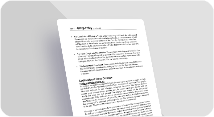 Part 11 – Group Policy (continued) WORDS IN ITALICS ARE EXPLAINED IN PART 2. Page 100 You Commit Acts of Physical or Verbal Abuse. Your coverage in this health plan will be canceled if you commit acts of physical or verbal abuse that pose a threat to, or a threat to the health of, health care providers or other members or employees of Blue Cross Blue Shield HMO Blue or Blue Cross and Blue Shield of Massachusetts, Inc., and these acts are not related to your physical condition or mental condition. In this case, this termination will follow the procedures that have been approved by the Massachusetts Commissioner of Insurance. You Fail to Comply with Plan Provisions. Your coverage in this health plan will be canceled if you fail to comply in a material way with any provision of the group contract. For example, if you fail to provide information that Blue Cross Blue Shield HMO Blue requests related to your coverage in this health plan, Blue Cross Blue Shield HMO Blue may terminate your coverage. This Health Plan Is Discontinued. Your coverage in this health plan will be canceled if Blue Cross Blue Shield HMO Blue discontinues this health plan. Blue Cross Blue Shield HMO Blue may discontinue this health plan for any reason as of a date approved by the Massachusetts Commissioner of Insurance. Continuation of Group Coverage Family and Medical Leave Act An employee may continue coverage in this health plan under a group contract as provided by the Family and Medical Leave Act. The Family and Medical Leave Act will generally apply to you if your group has 50 or more employees. For more information, contact your plan sponsor. If the employee chooses to continue group coverage during a qualifying leave, the employee will be given the same health care benefits that would have been provided if the employee were working, with the same premium contribution ratio. If the employee’s premium for continued coverage under the group contract is more than 30 days late, the plan sponsor will send written notice to the employee. It will tell the employee that their coverage will be terminated. It will also give the date of the termination if payment is not received by that date. This notice will be mailed at least 15 days before the termination date. If coverage in this health plan under the group contract is discontinued due to non-payment of premium, the employee’s coverage will be restored when they return to work to the same level of benefits as those the employee would have had if the leave had not been taken and the premium payment(s) had not been missed. This includes coverage for eligible dependents. The employee will not be required to meet any qualification requirements imposed by Blue Cross Blue Shield HMO Blue when they return to work. This includes: new or additional waiting periods; waiting for an open enrollment period; or passing a medical exam to reinstate coverage. You should contact your plan sponsor with any questions that you may have about your coverage during a leave of absence. Limited Extension of Group Coverage under State Law If you lose eligibility for coverage in this health plan under a group contract due to a plant closing or a partial plant closing (as defined by law) in Massachusetts, you may continue coverage under the group contract as provided by state law. If this happens to you, you and your group will each pay your shares of the premium cost for up to 90 days after the plant closing. Then, to continue your group coverage for up to 39 more weeks, you will pay 100% of the premium cost. At this same time, you may also be eligible for continued group coverage under other state laws or under federal law (see below). If you are, the starting date for continued group coverage under all of these laws will be the same date. But, after the 90- day extension period provided by this state law ends, you may have to pay more premium to continue your coverage under the group contract. If you become eligible for coverage under another employer