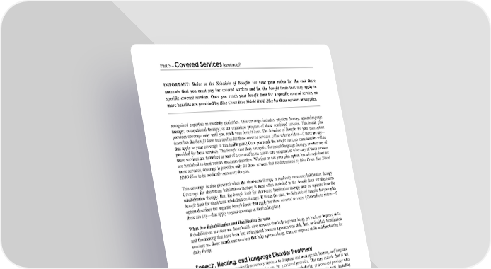 Part 5 – Covered Services (continued) IMPORTANT: Refer to the Schedule of Benefits for your plan option for the cost share amounts that you must pay for covered services and for the benefit limits that may apply to specific covered services. Once you reach your benefit limit for a specific covered service, no more benefits are provided by Blue Cross Blue Shield HMO Blue for those services or supplies. WORDS IN ITALICS ARE EXPLAINED IN PART 2. Page 66 recognized expertise in specialty pediatrics. This coverage includes: physical therapy; speech/language therapy; occupational therapy; or an organized program of these combined services. This health plan provides coverage only until you reach your benefit limit. The Schedule of Benefits for your plan option describes the benefit limit that applies for these covered services. (Also refer to riders—if there are any— that apply to your coverage in this health plan.) Once you reach the benefit limit, no more benefits will be provided for these services. The benefit limit does not apply: for speech/language therapy; or when any of these services are furnished as part of a covered home health care program; or when any of these services are furnished to treat autism spectrum disorders. Whether or not your plan option has a benefit limit for these services, coverage is provided only for those services that are determined by Blue Cross Blue Shield HMO Blue to be medically necessary for you. This coverage is also provided when the short-term therapy is medically necessary habilitation therapy. Coverage for short-term habilitation therapy is most often included in the benefit limit for short-term rehabilitation therapy. But, the benefit limit for short-term habilitation therapy may be separate from the benefit limit for short-term rehabilitation therapy. If this is the case, the Schedule of Benefits for your plan option describes the separate benefit limits that apply for these covered services. (Also refer to riders—if there are any—that apply to your coverage in this health plan.) What Are Rehabilitation and Habilitation Services Rehabilitation services are those health care services that help a person keep, get back, or improve skills and functioning that have been lost or impaired because a person was sick, hurt, or disabled. Habilitation services are those health care services that help a person keep, learn, or improve skills and functioning for daily living. Speech, Hearing, and Language Disorder Treatment This health plan covers medically necessary services to diagnose and treat speech, hearing, and language disorders when the services are furnished for you by a covered provider. This may include (but is not limited to): a licensed audiologist; or a licensed speech-language pathologist; or a covered provider who has a recognized expertise in specialty pediatrics. This coverage includes: diagnostic tests, including hearing exams and tests; speech/language therapy; and medical care to diagnose or treat speech, hearing, and language disorders. A benefit limit that applies for short-term rehabilitation therapy does not apply for speech/language therapy. No benefits are provided when these services are furnished in a school-based setting. Surgery as an Outpatient This health plan covers outpatient surgical services when they are furnished for you by a covered provider. This may include (but is not limited to): a surgical day care unit of a hospital; or an ambulatory surgical facility; or a physician; or a nurse practitioner; or a covered provider who has a recognized expertise in specialty pediatrics. This coverage includes: Routine circumcision.