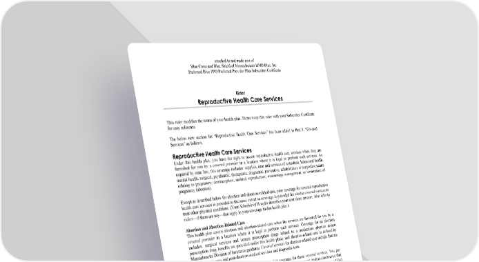 attached to and made part of Blue Cross and Blue Shield of Massachusetts HMO Blue, Inc. Preferred Blue PPO Preferred Provider Plan Subscriber Certificate R08-3841 (2023) to be attached to HMO-PPO Page 1 hppo08-3841 Rider Reproductive Health Care Services This rider modifies the terms of your health plan. Please keep this rider with your Subscriber Certificate for easy reference. The below new section for “Reproductive Health Care Services” has been added to Part 5, “Covered Services” as follows: Reproductive Health Care Services Under this health plan, you have the right to access reproductive health care services when they are furnished for you by a covered provider in a location where it is legal to perform such services. As required by state law, this coverage includes: supplies, care and services of a medical, behavioral health, mental health, surgical, psychiatric, therapeutic, diagnostic, preventive, rehabilitative or supportive nature relating to pregnancy; contraception; assisted reproduction; miscarriage management; or termination of pregnancy (abortion). Except as described below for abortion and abortion-related care, your coverage for covered reproductive health care services is provided to the same extent as coverage is provided for similar covered services to treat other physical conditions. (Your Schedule of Benefits describes your cost share amount. Also refer to riders—if there are any—that apply to your coverage in this health plan.) Abortion and Abortion-Related Care This health plan covers abortion and abortion-related care when the services are furnished for you by a covered provider in a location where it is legal to perform such services. Coverage for an abortion includes: surgical services and certain prescription drugs related to a medication abortion (when prescription drug benefits are provided under this health plan); and abortion-related care as defined by Massachusetts Division of Insurance guidance. Covered services for abortion-related care include (but are not limited to): pre- and post-abortion medical services and diagnostic tests. As required by state law, this health plan provides full coverage for these covered services. You pay nothing for in-network and out-of-network benefits. (Any deductible, copayment, and/or coinsurance that you would normally pay will not apply.) The only exception is when you are enrolled in a qualified HSA-compliant high deductible health plan. In this case, your deductible will apply to these covered services. Otherwise, any cost share amounts will not apply. Note: If your employer is a church or qualified church-controlled organization, these services may not be available to you. To find out, you can check with your employer. Also refer to riders—if there are any—that apply to your coverage in this health plan. All other provisions remain as described in your Subscriber Certificate.