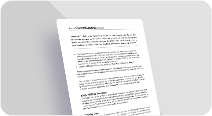 Part 5 – Covered Services (continued) IMPORTANT: Refer to the Schedule of Benefits for your plan option for the cost share amounts that you must pay for covered services and for the benefit limits that may apply to specific covered services. Once you reach your benefit limit for a specific covered service, no more benefits are provided by Blue Cross Blue Shield HMO Blue for those services or supplies. WORDS IN ITALICS ARE EXPLAINED IN PART 2. Page 54 Pain management services furnished for you by a covered provider. These covered providers can furnish services such as: nerve block injections or epidural steroid injections (these injections are covered as a surgical service, see “Surgery as an Outpatient”); and electro-muscular stimulation and spinal cord and dorsal root stimulation (see “Medical Care Outpatient Visits” for your coverage for outpatient care to diagnose or treat your medical condition). Occupational therapy and/or physical therapy (see “Short-Term Rehabilitation Therapy”). Alternative treatments to opiates for pain management also include non-opiate covered drugs and supplies that are furnished by a covered pharmacy when your prescription drug coverage is provided under this health plan. Your coverage for these covered services is provided to the same extent as coverage is provided for similar covered services to diagnose and treat a physical condition. (A benefit limit may apply for a specific covered service listed above. If this is the case, the benefit limit will be described in the Schedule of Benefits for your plan option and/or any riders that apply to your coverage in this health plan.) PANS/PANDAS Treatment This health plan covers services to treat pediatric autoimmune neuropsychiatric disorders (PANS) associated with streptococcal infections and pediatric acute-onset neuropsychiatric syndrome (PANDAS) including, but not limited to the use of intravenous immunoglobulin therapy when they are furnished by a covered provider. Your coverage for these covered services is provided to the same extent as coverage is provided for similar covered services to treat other physical conditions. Podiatry Care This health plan covers non-routine podiatry (foot) care when it is furnished for you by a covered provider. This may include (but is not limited to): a physician; or a podiatrist. This coverage includes: diagnostic lab tests; diagnostic x-rays; surgery and necessary postoperative care; and other medically necessary foot care such as treatment for hammertoe and osteoarthritis. No benefits are provided for: routine foot care services such as trimming of corns, trimming of nails, and other hygienic care, except when the care is medically necessary because you have systemic circulatory disease (such as diabetes); and certain non-routine foot care services and supplies such as foot orthotics, arch supports, shoe (foot) inserts, orthopedic and corrective shoes that are not part of a leg brace (except as described in this Subscriber Certificate for “Prosthetic Devices”), and fittings, castings, and other services related to devices for the feet. Prescription Drugs and Supplies This health plan covers certain drugs and supplies that are furnished by a covered pharmacy. This coverage is provided only when all of the following criteria are met. The drug or supply is listed on the Blue Cross Blue Shield HMO Blue Drug Formulary as a covered drug or supply. For certain covered drugs, you must have prior approval from Blue Cross Blue Shield